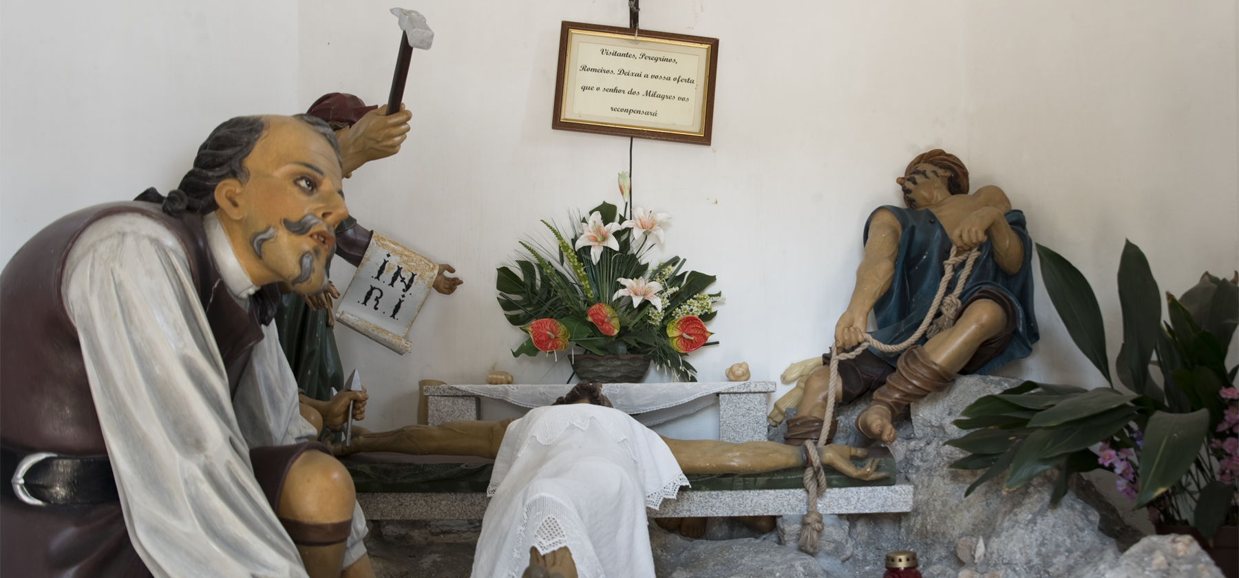 Muito simpático, abre a porta da capela que no pequeno espaço interior tem cinco figuras, em tamanho correspondente ao de uma pessoa, as quais estão em redor de Cristo deitado na cruz, quando da crucificação.
