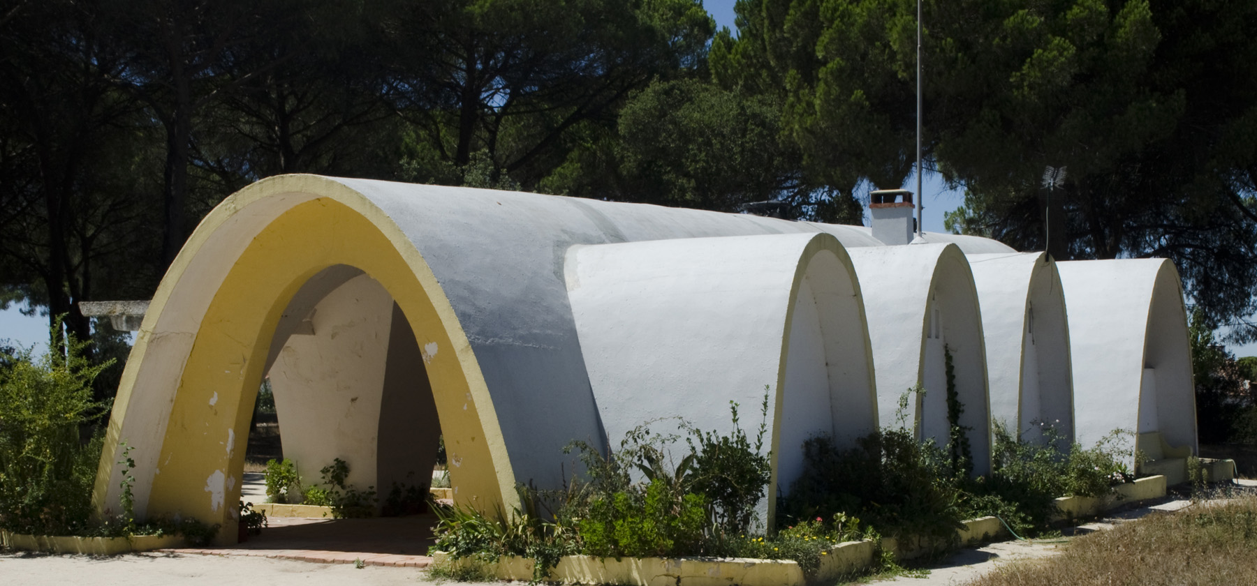 Os edifícios são de cimento estão pintados de branco e as linhas curvas têm uma pintura amarela. As escolas estão a funcionar e em redor há espaço livre e uma área arborizada.