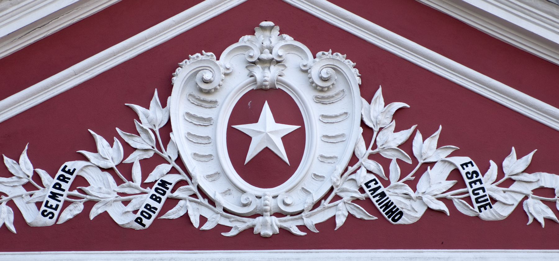 As duas construções estão pintadas de vermelho, com colunas, a habitual estrela e a frase que era o lema de Grandella aos alunos: “Sempre por bom caminho e segue!”