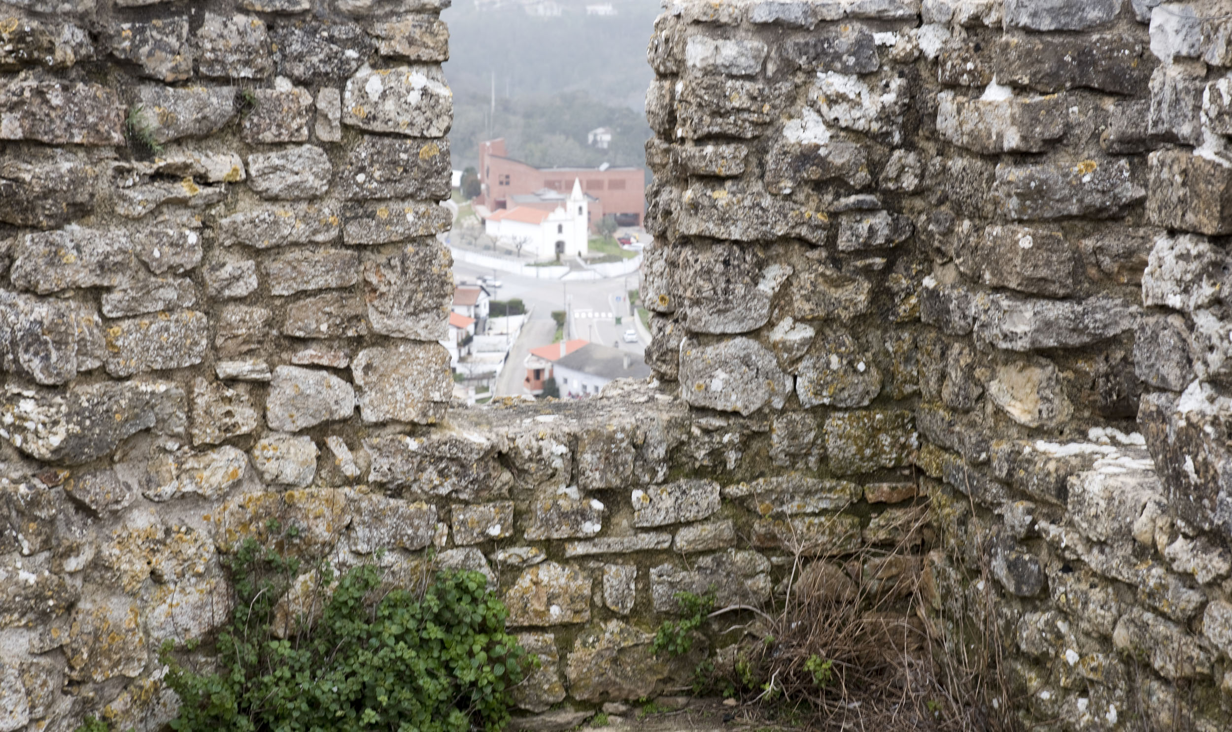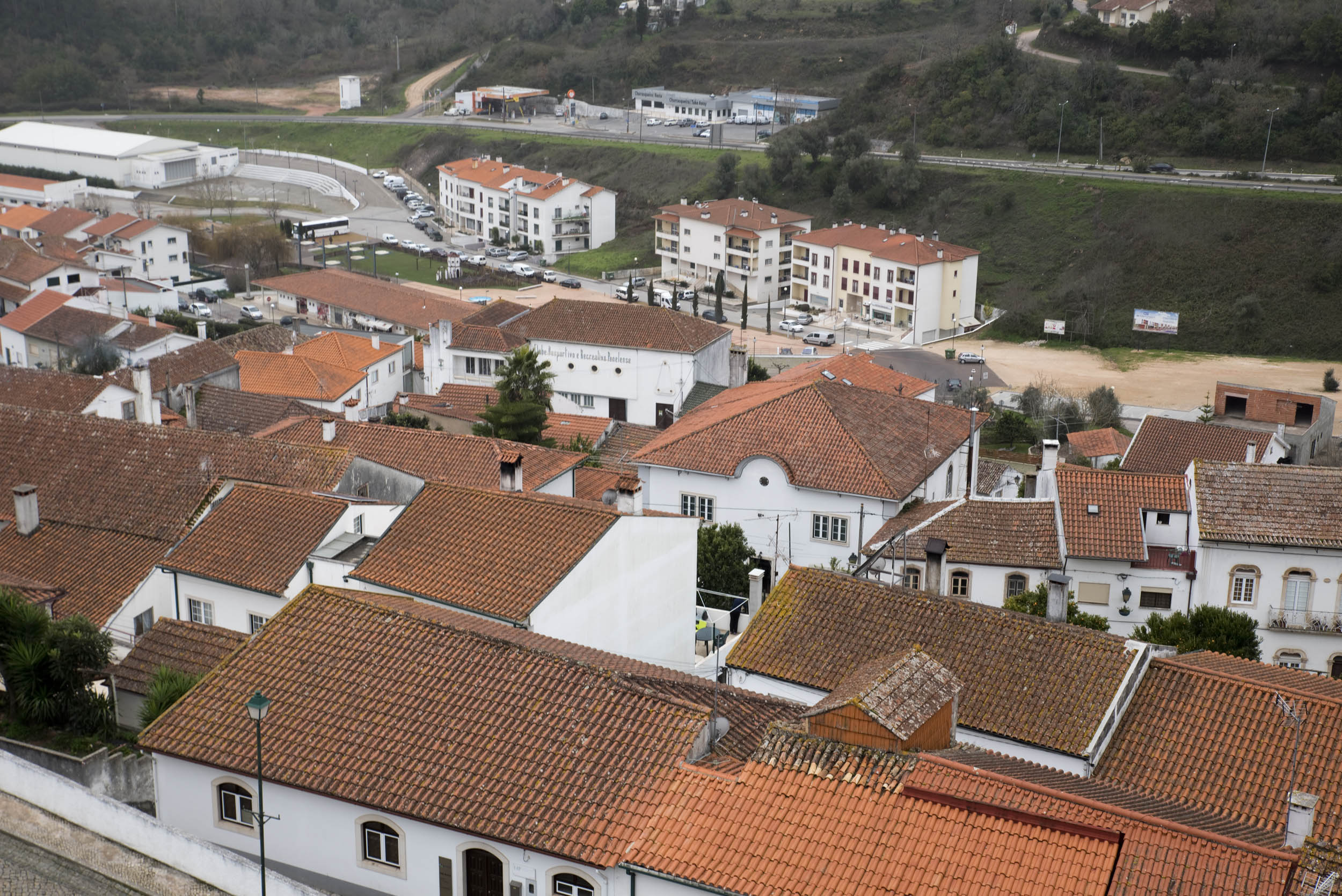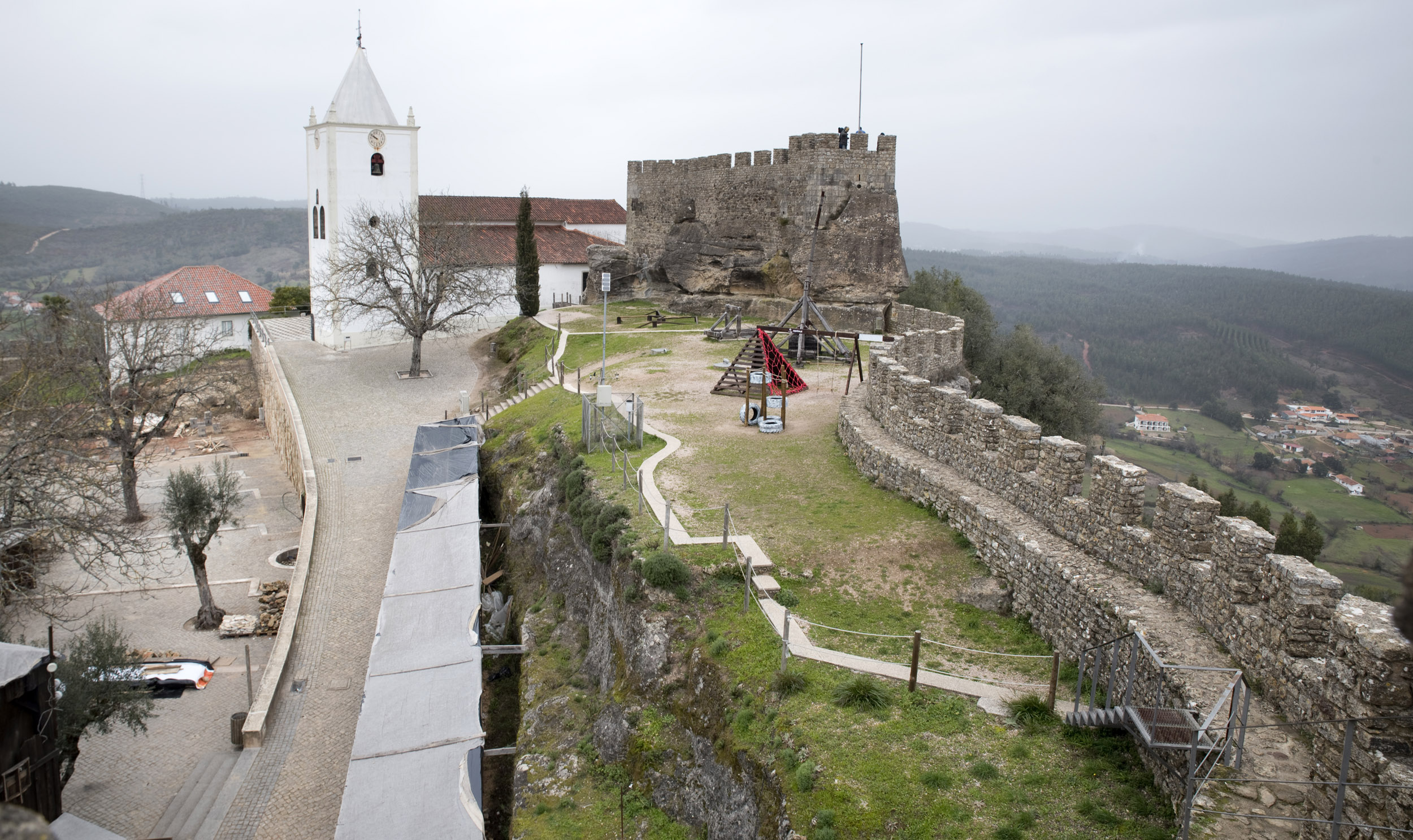 Vê-se a vila aos pés do castelo, a descer a encosta e o horizonte alarga-se com as serras.