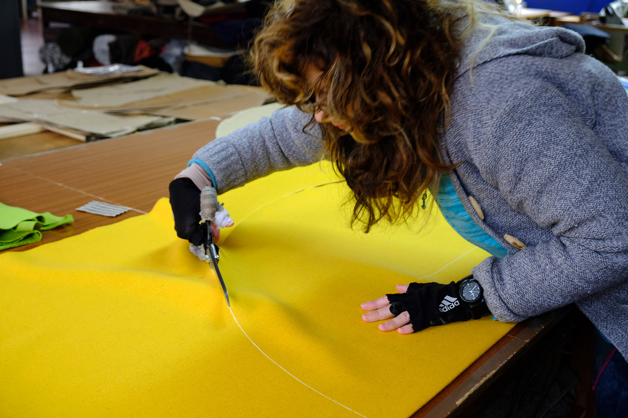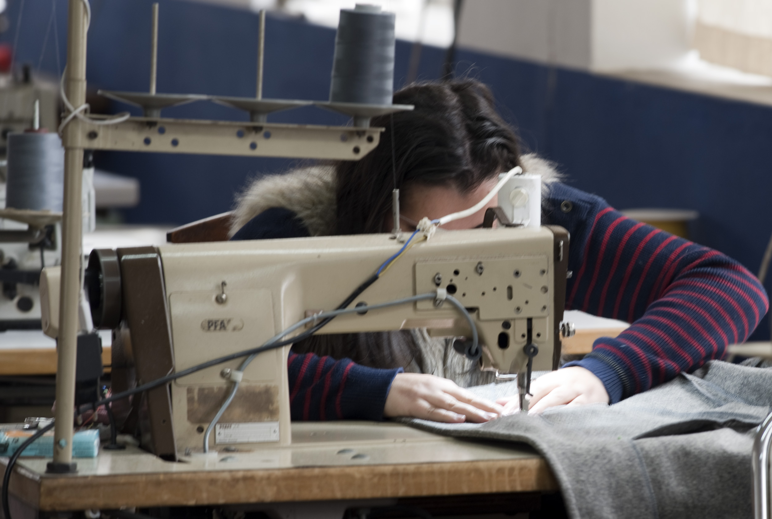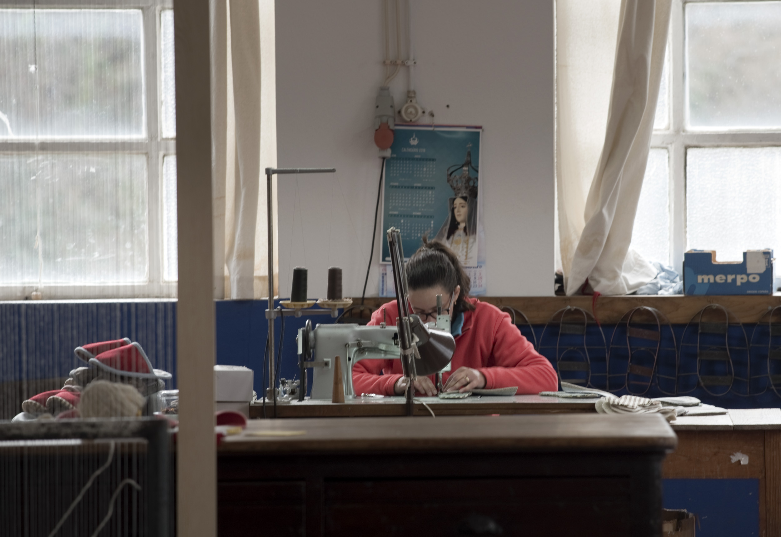 As peças de burel são confeccionadas numa sala grande. Quase todo o trabalho é manual.