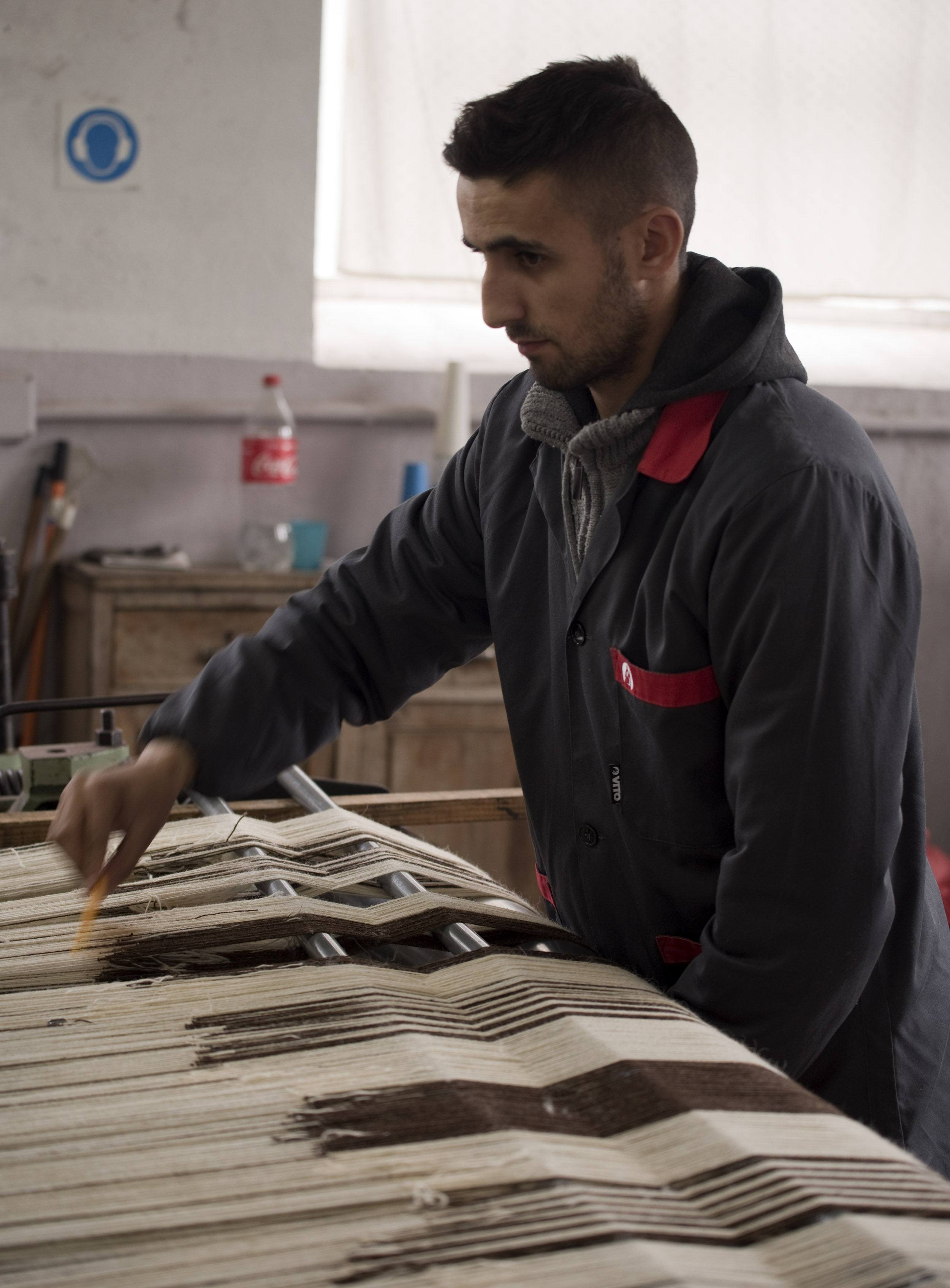 Uma mulher que vai reparando manualmente as falhas dos teares. Coloca fio a fio manualmente e controla a qualidade final.