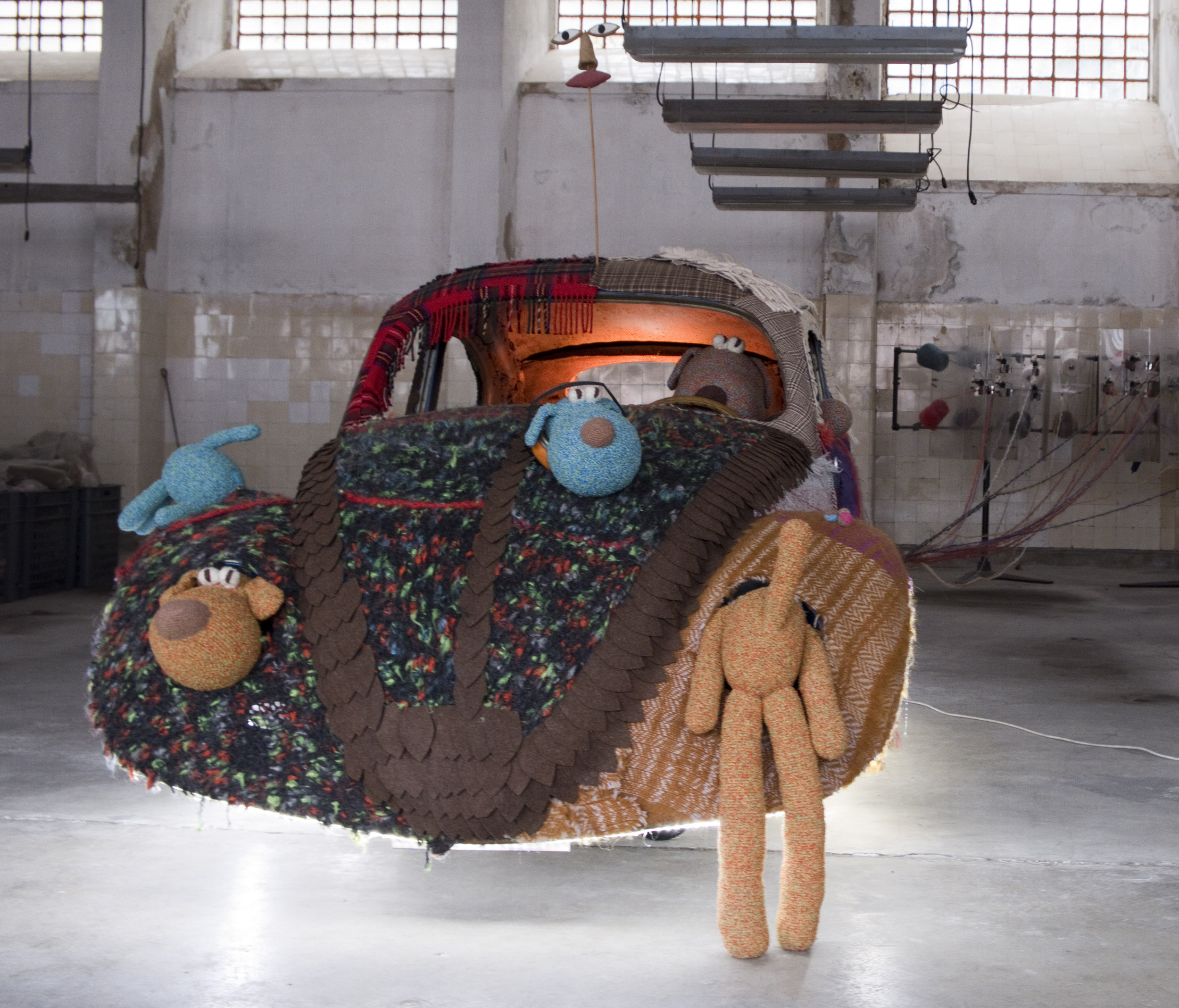 Uma outra obra de arte que não se esquece na visita é um carocha. O carro está vestido de lã, colorido e quebra o cinzentismo das paredes de uma sala da fábrica.