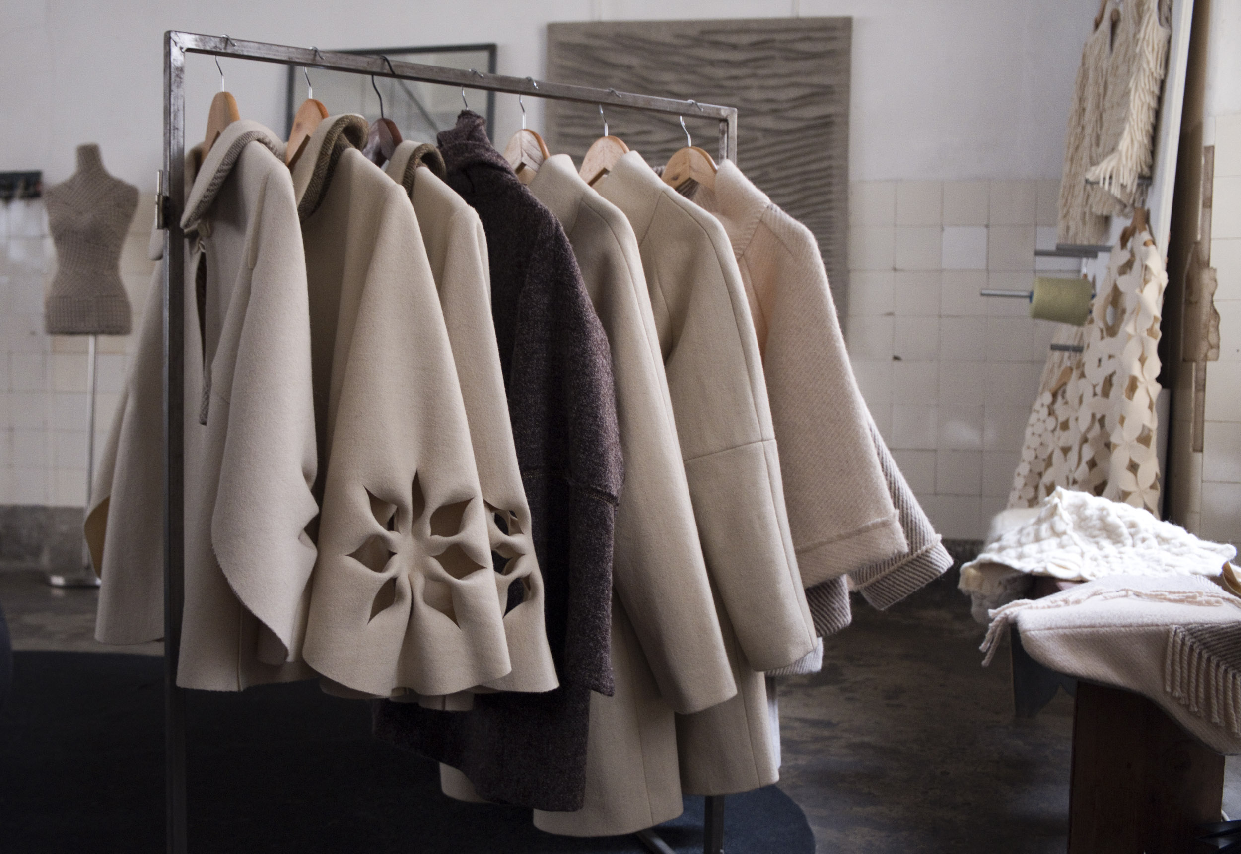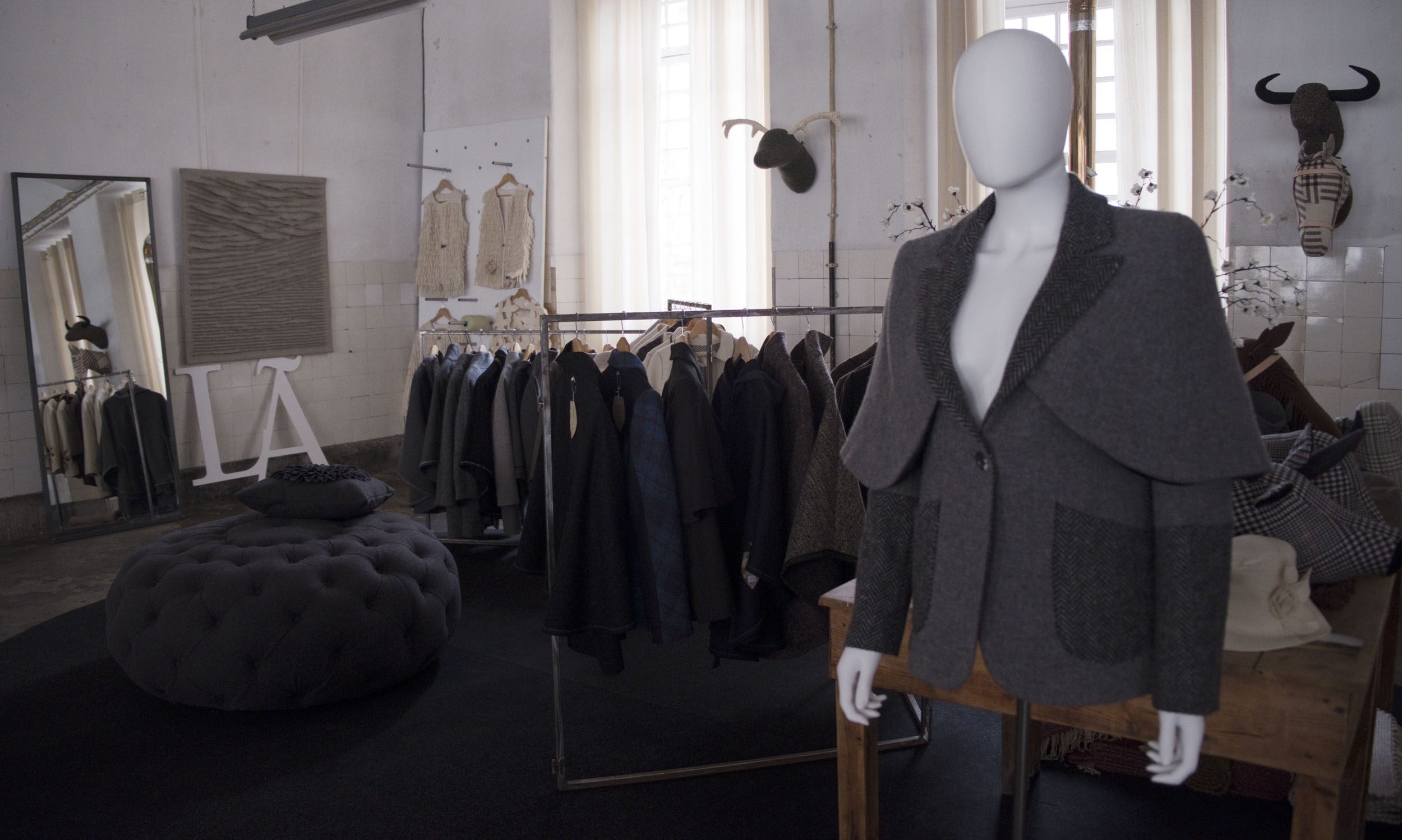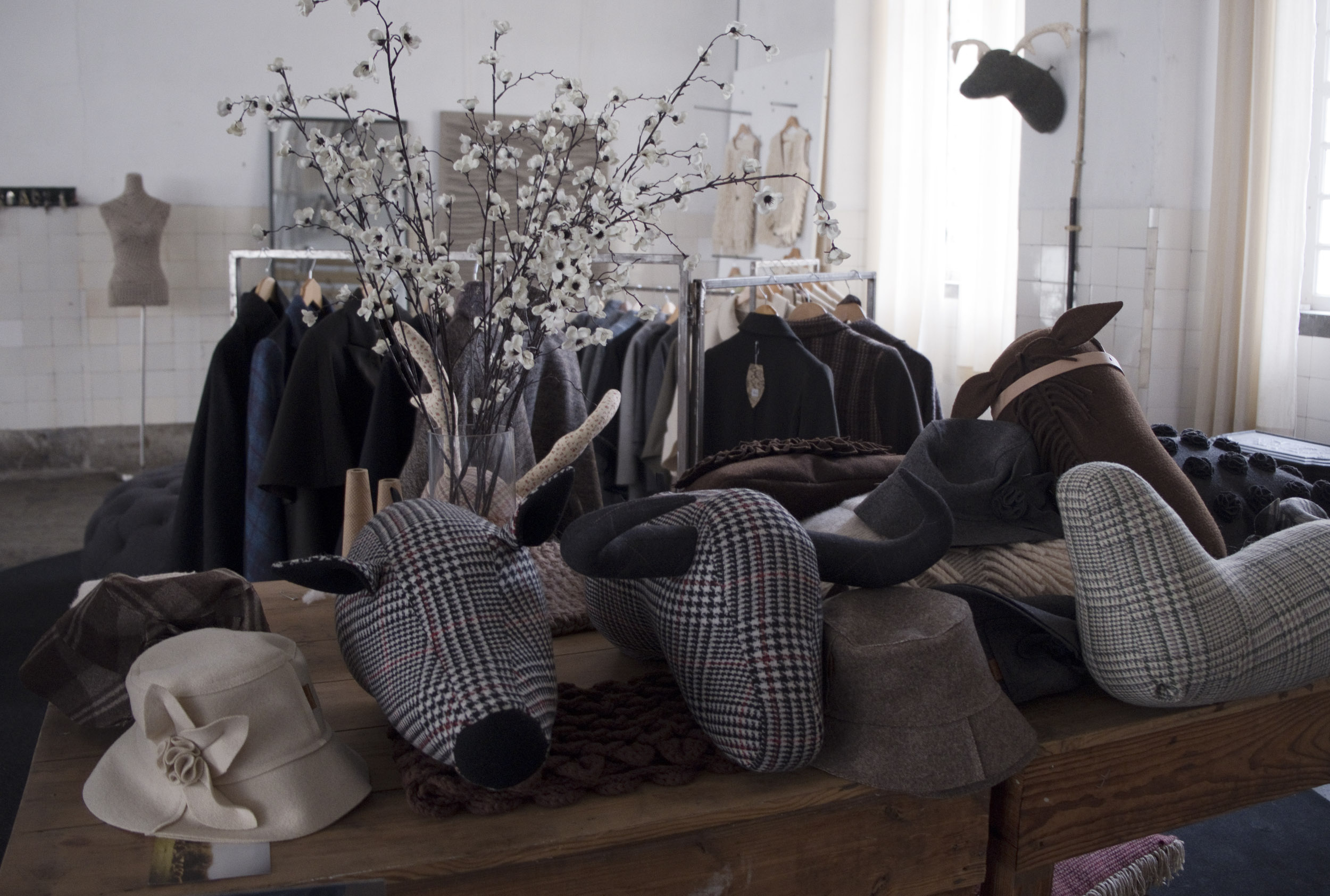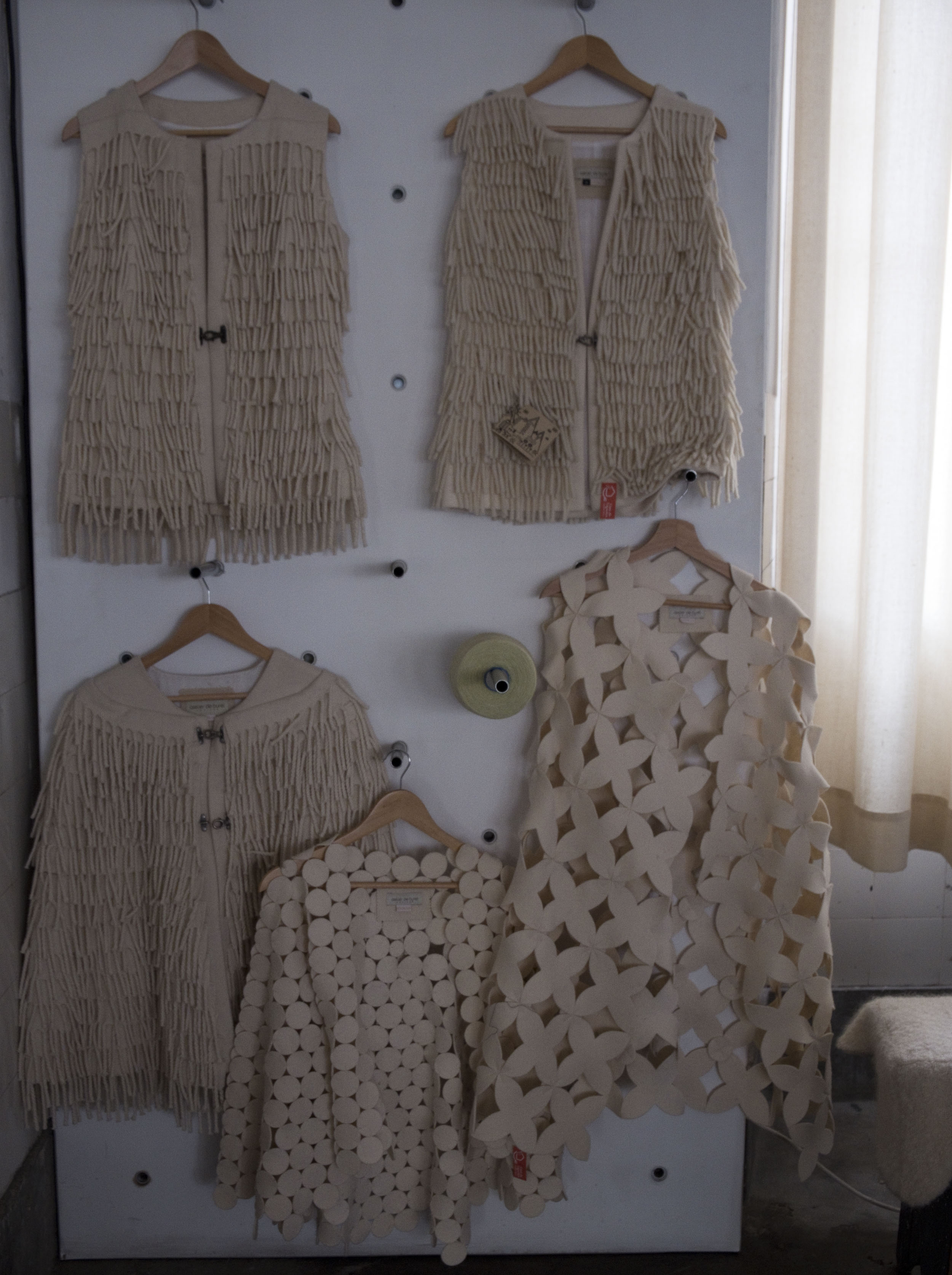 Na visita à fábrica podemos ver várias peças de vestuário, chapéus e objectos decorativos de Miguel Gigante em burel.