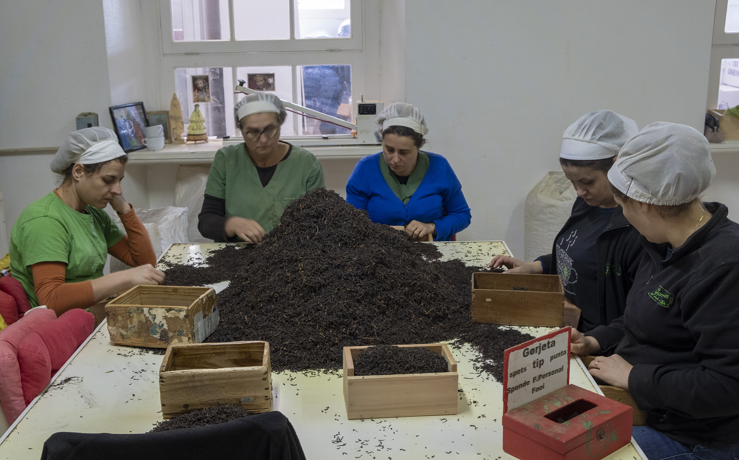 Sentadas próximo de uma máquina de há setenta anos faz as saquetas de chá num movimento sonoro e repetitivo. Tal como as mulheres que repetem os movimentos com as mãos a selecionarem o chá que se encontra num monte no centro da mesa. Separam as folhas e tiram pequenos paus que escaparam ao enrolador.