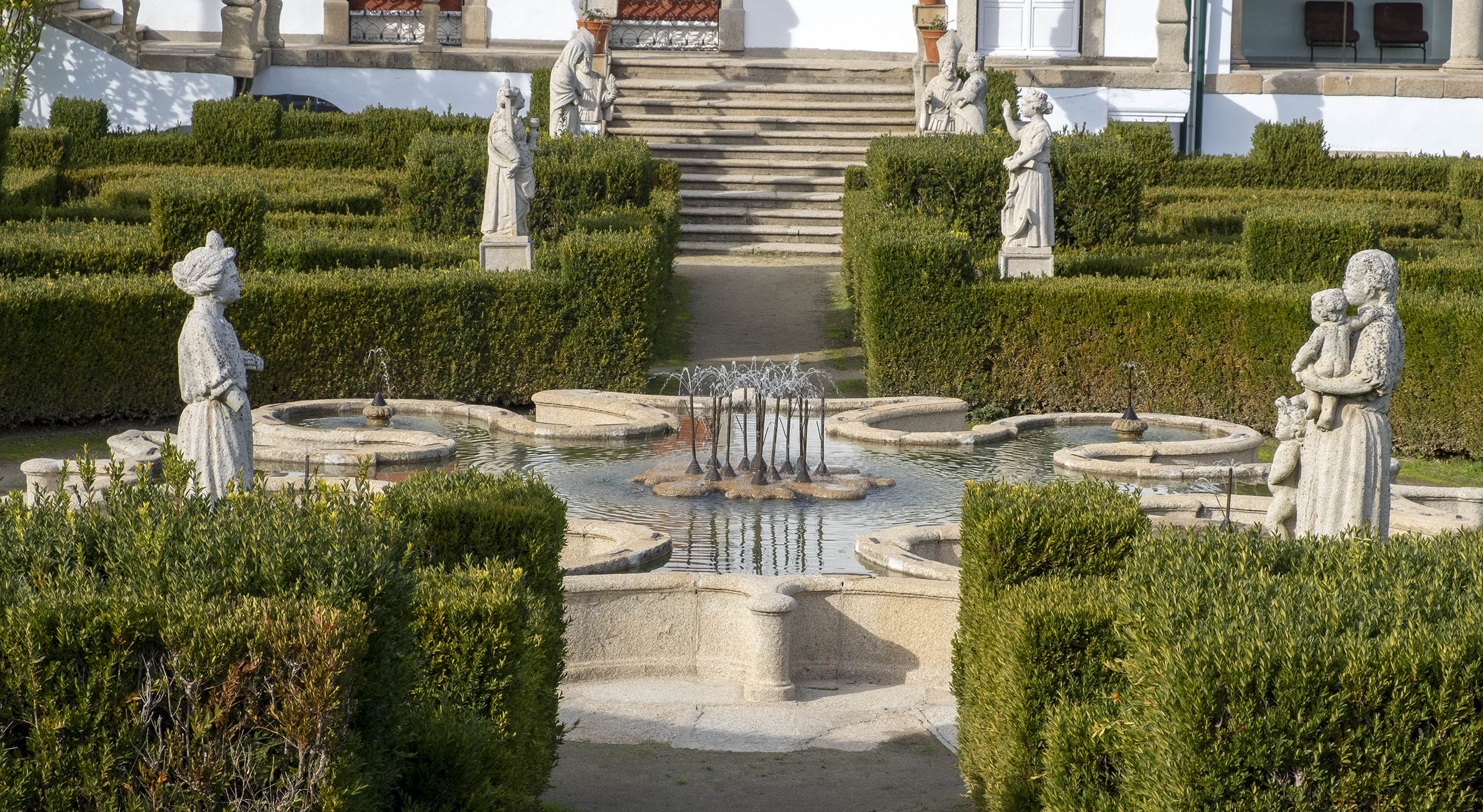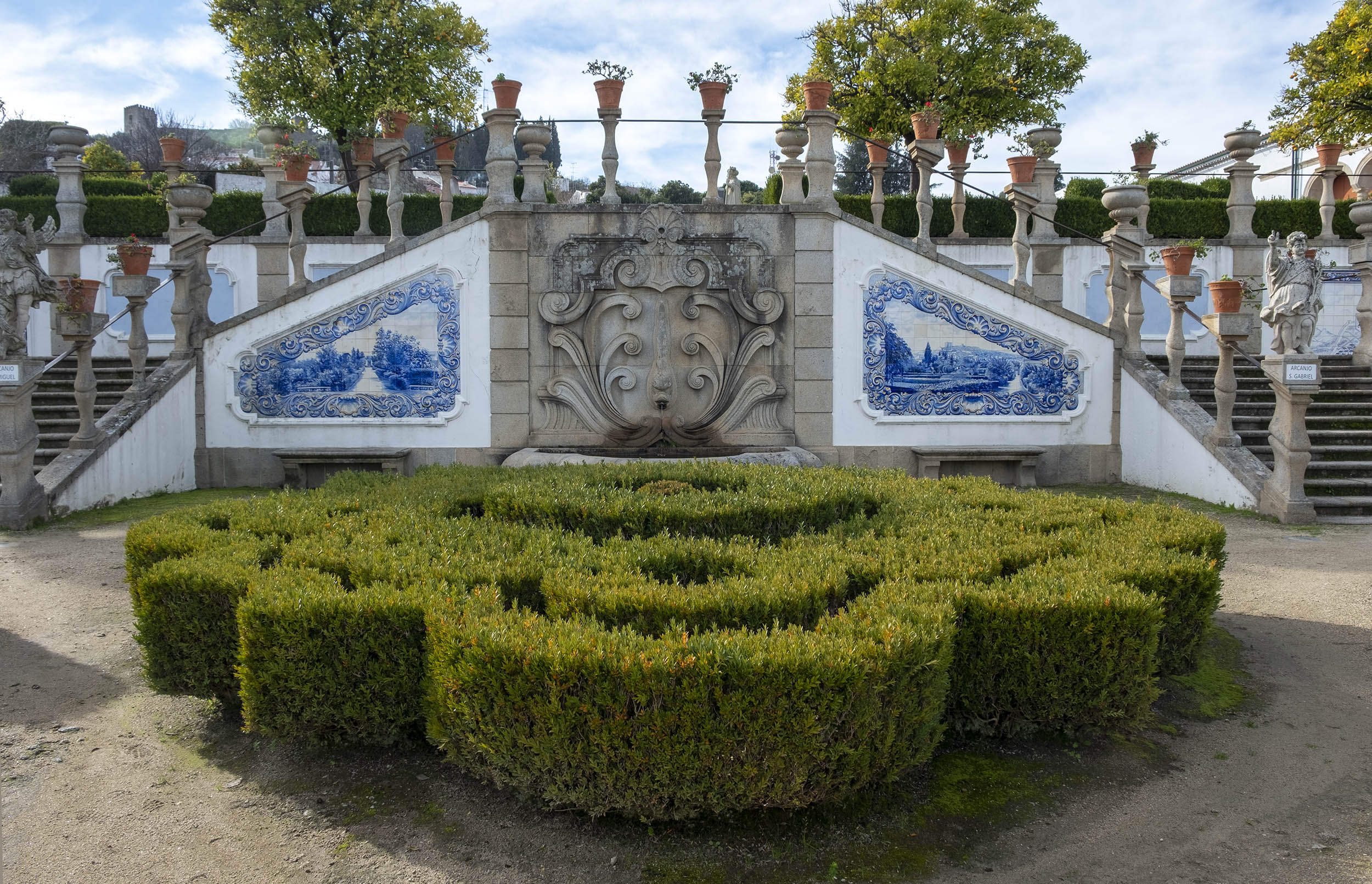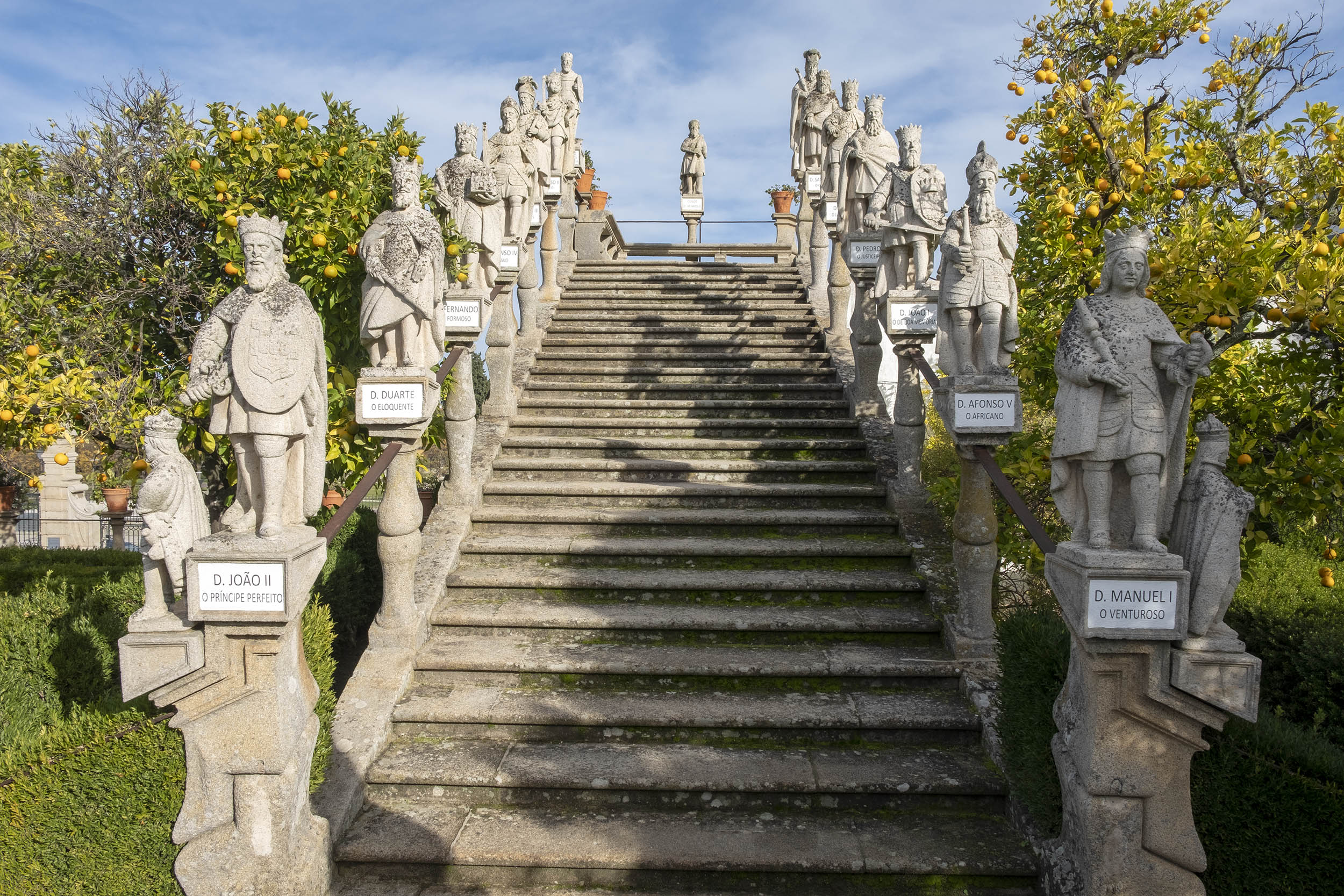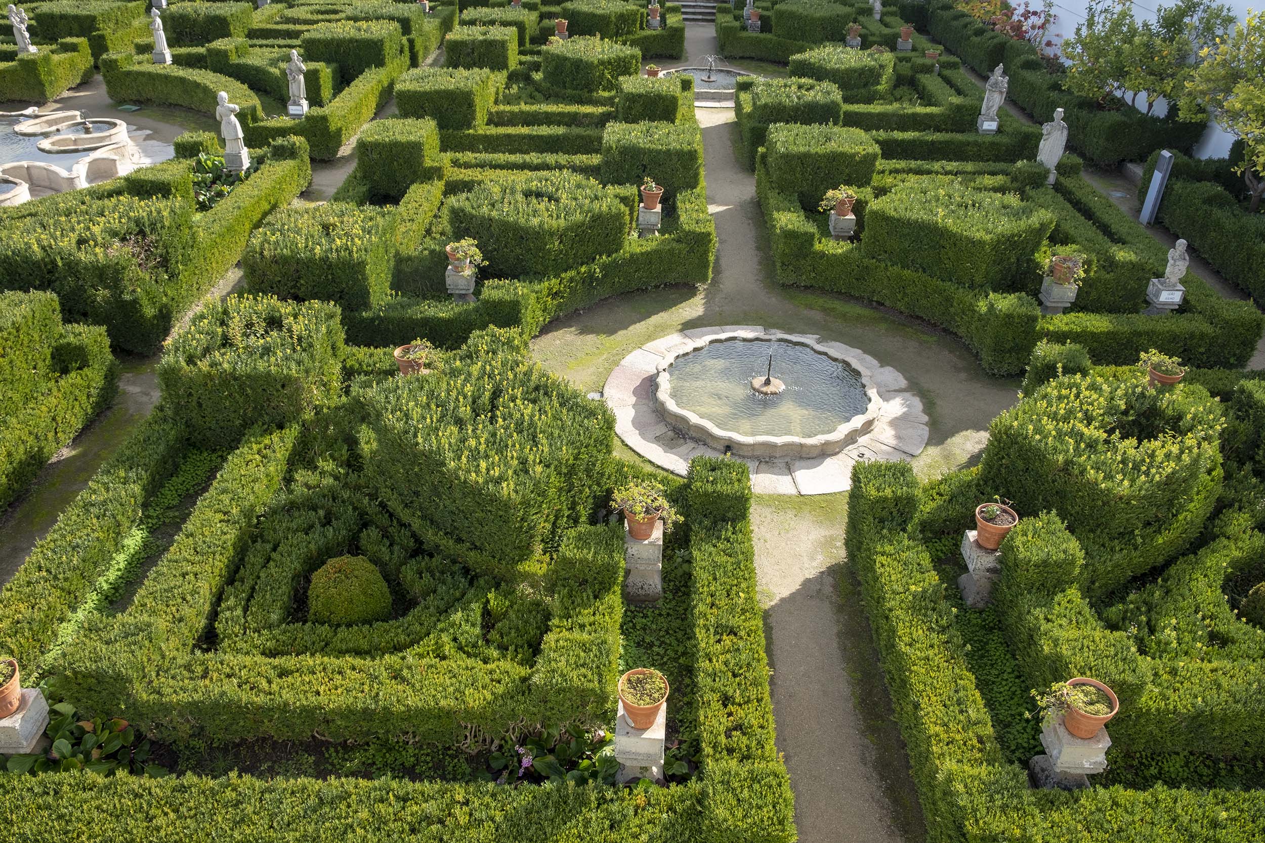 As estátuas estão dispersas ou alinhada ao lado de longas escadarias. O jardim tem ainda painéis de azulejos, muitos desenhos e recortes feitos com a arte dos jardineiros.