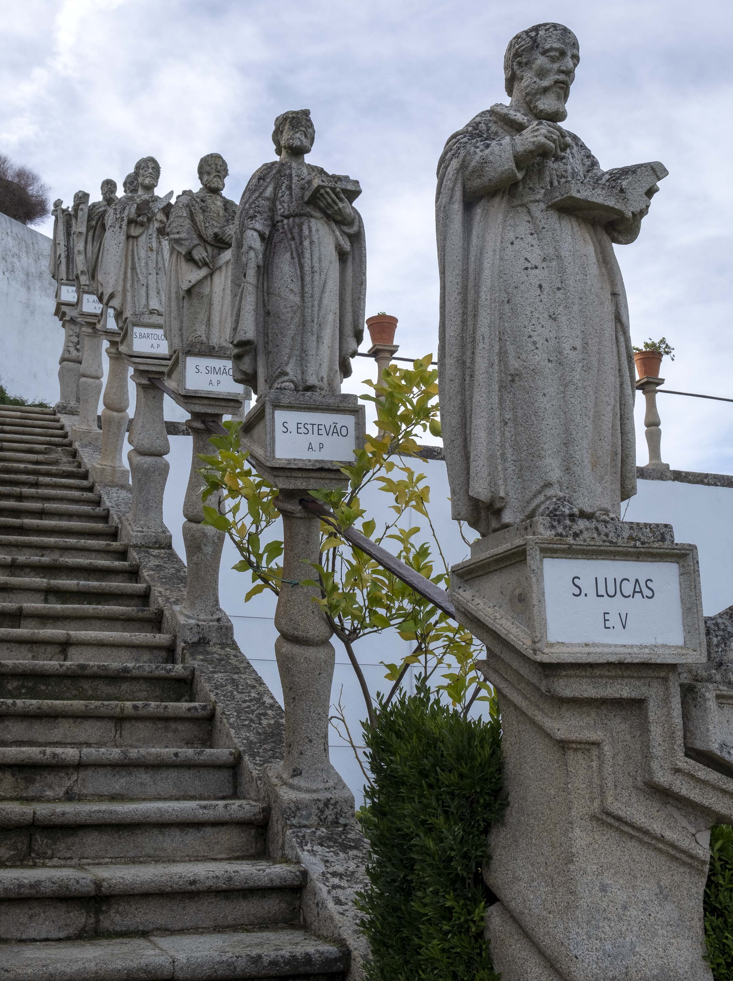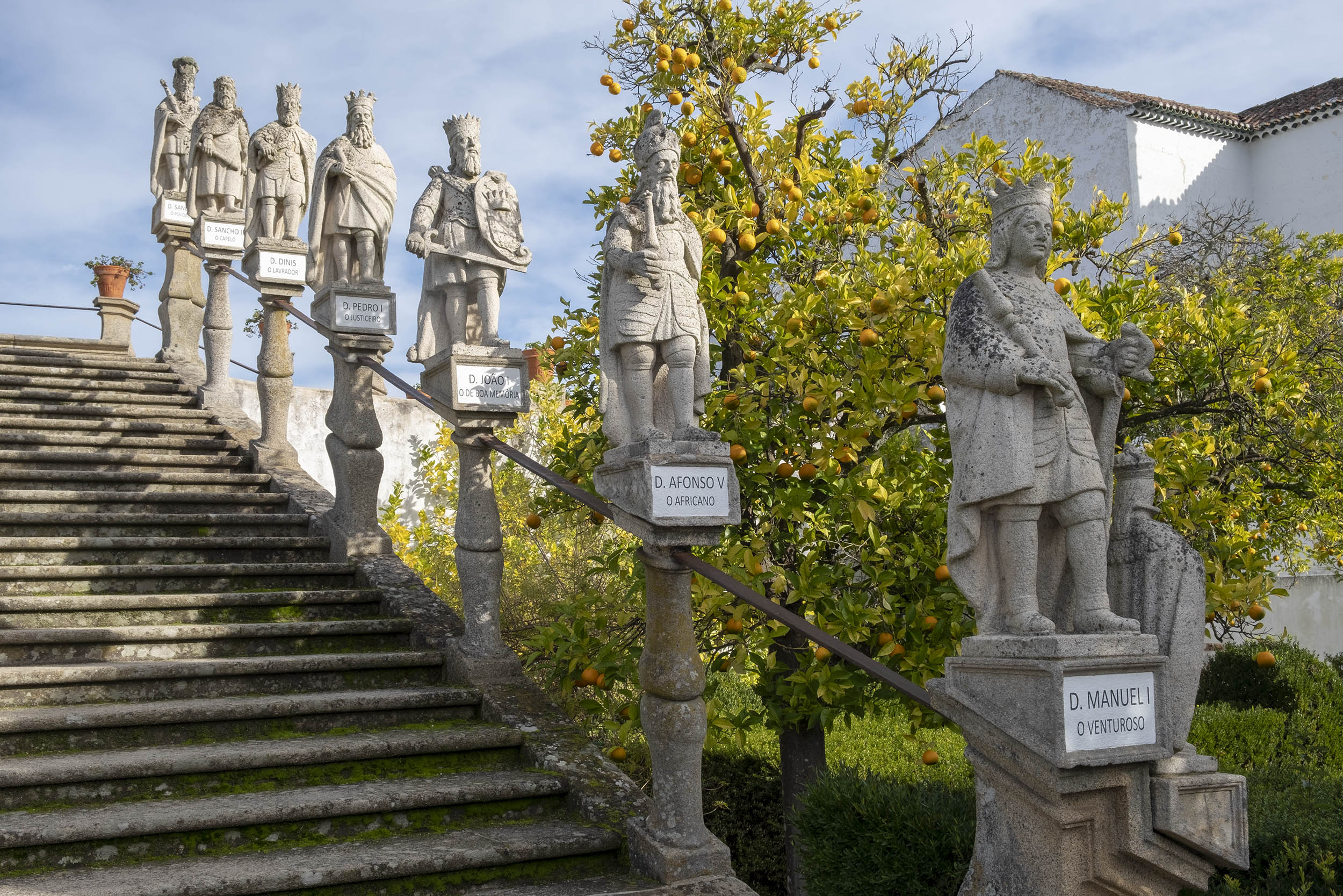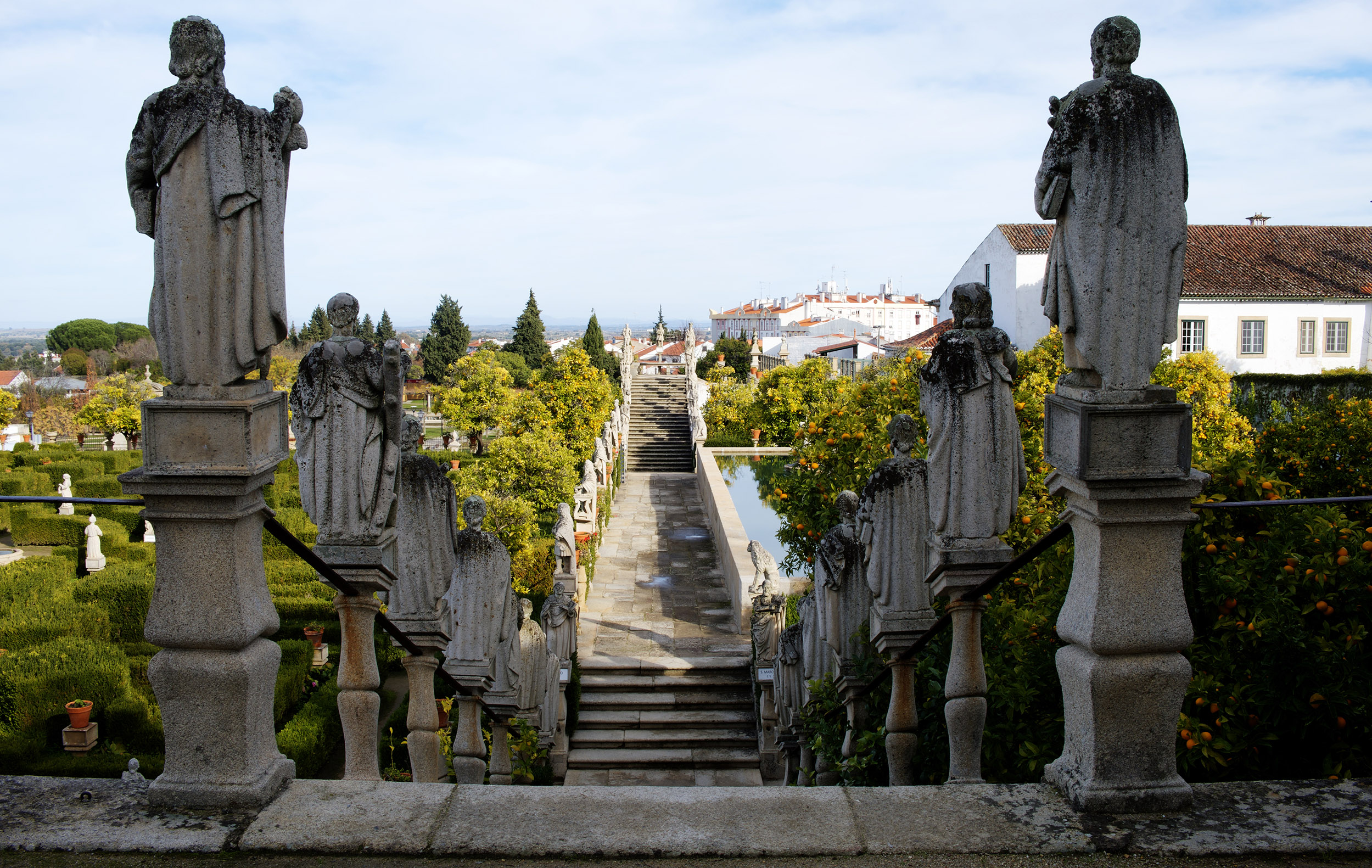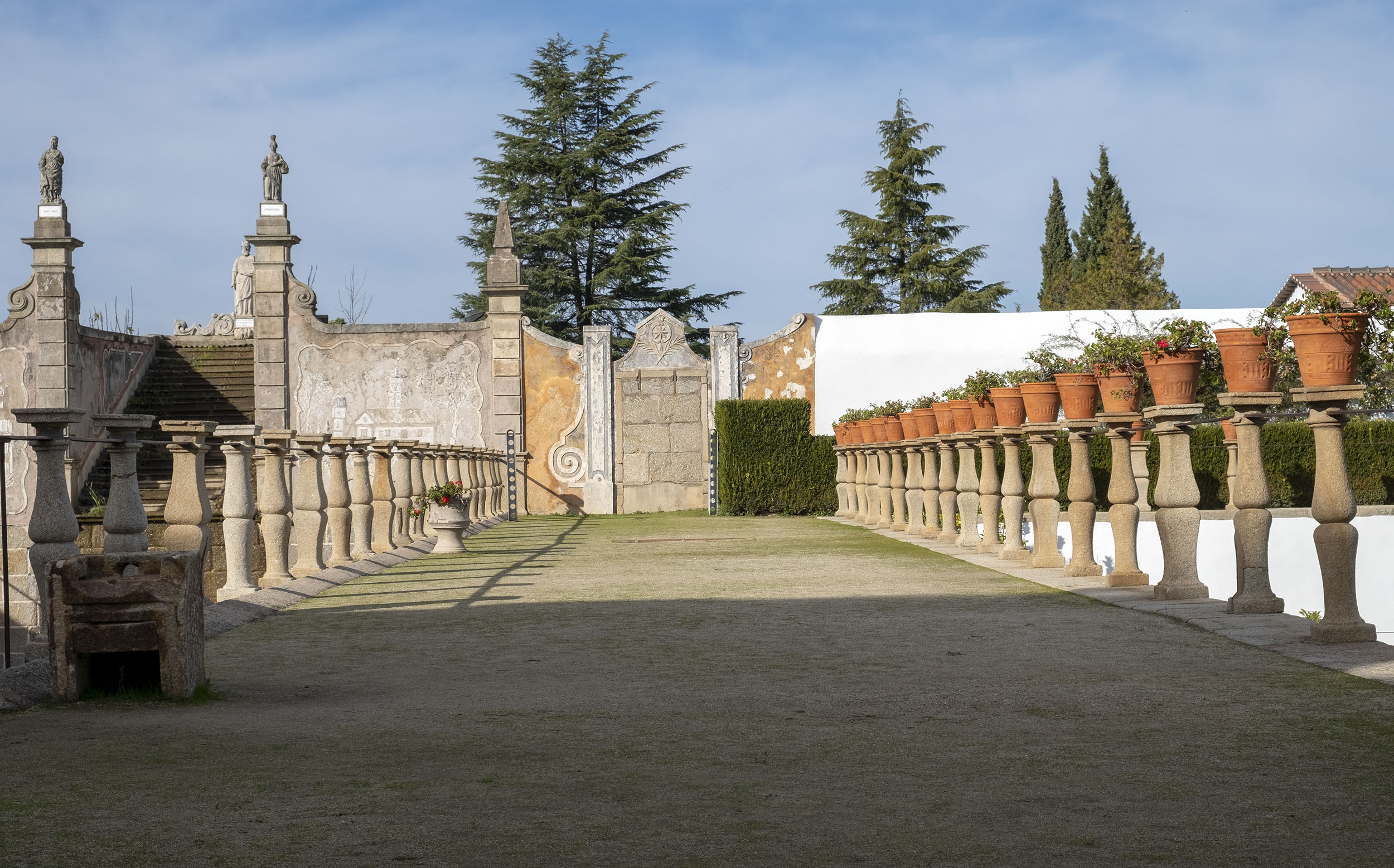 As estátuas estão dispersas ou alinhada ao lado de longas escadarias. O jardim tem ainda painéis de azulejos, muitos desenhos e recortes feitos com a arte dos jardineiros.