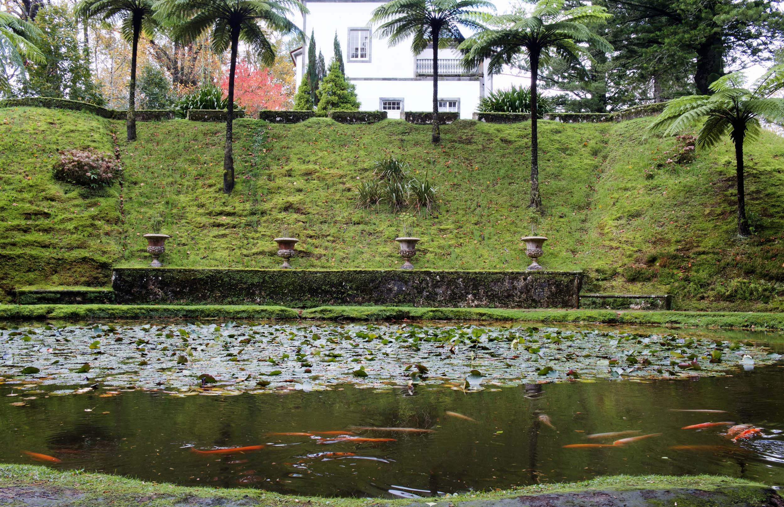 site_terra_nostra_banho_3251O enquadramento é muito bonito. O tanque tem uma pequena ilha, está rodeado de plantas e num dos lados, num declive mais acentuado, está a casa que serviu de residência às várias famílias proprietárias. A primeira foi a do comerciante e cônsul honorário dos EUA que em 1775 deu inicio a este projeto botânico.