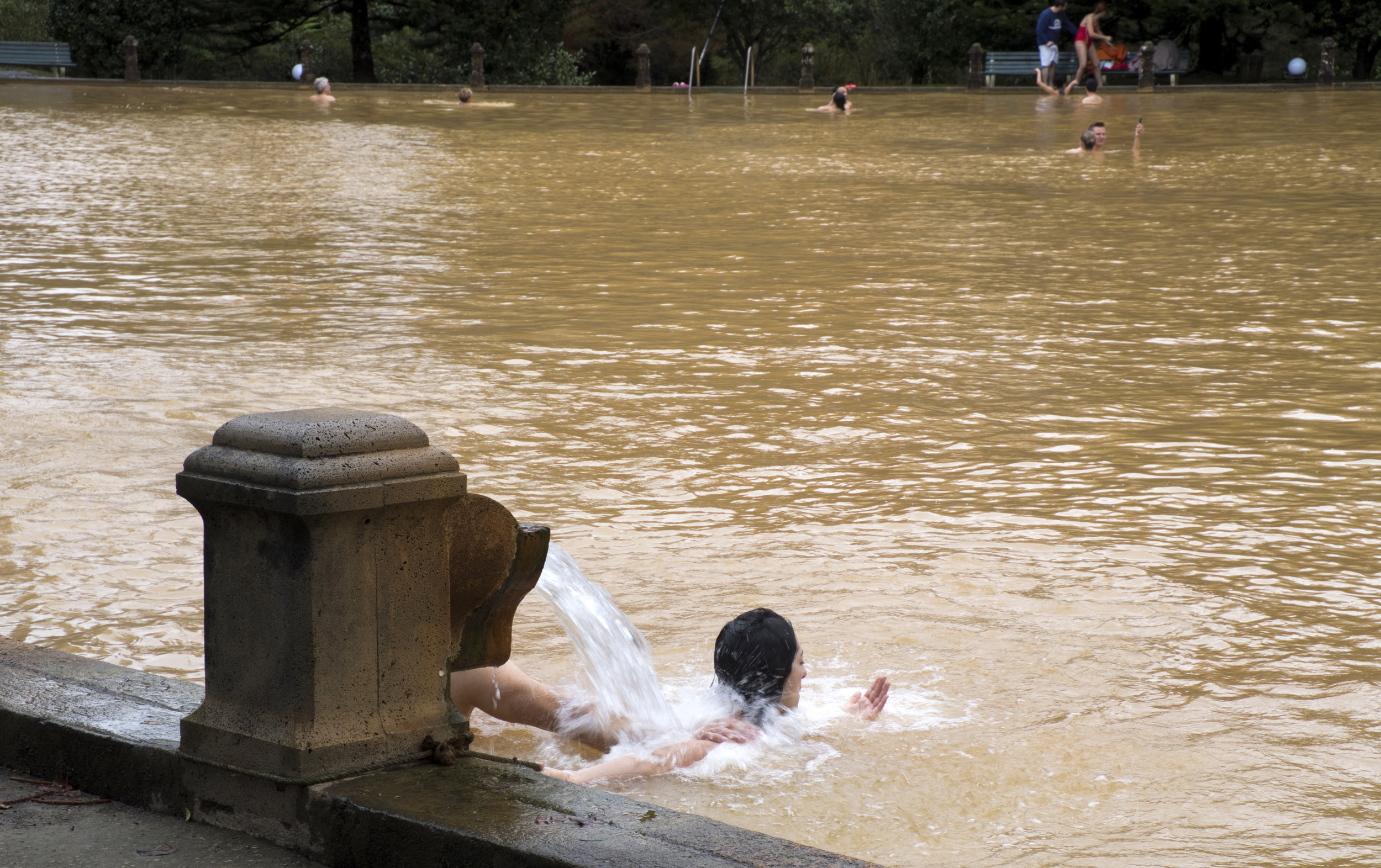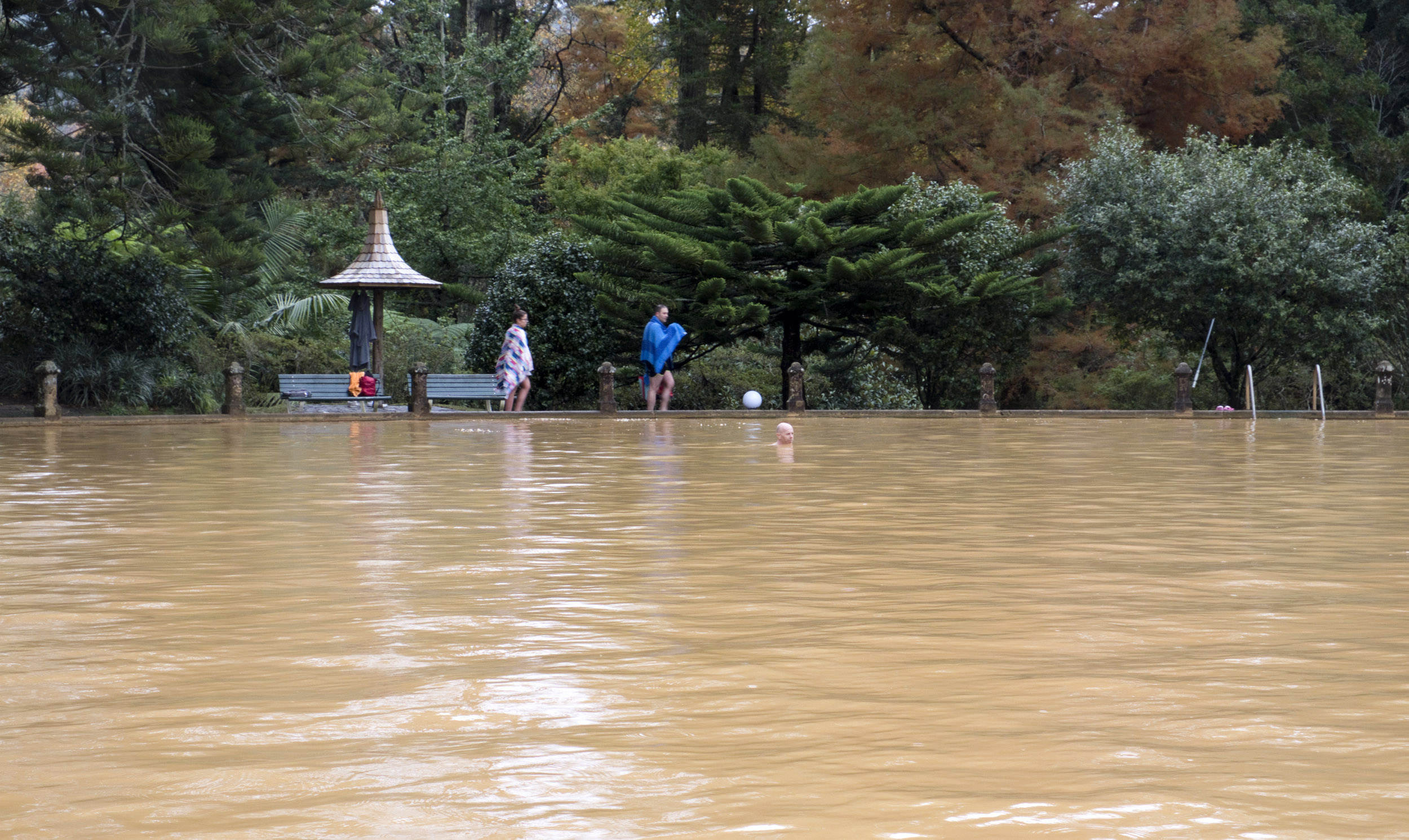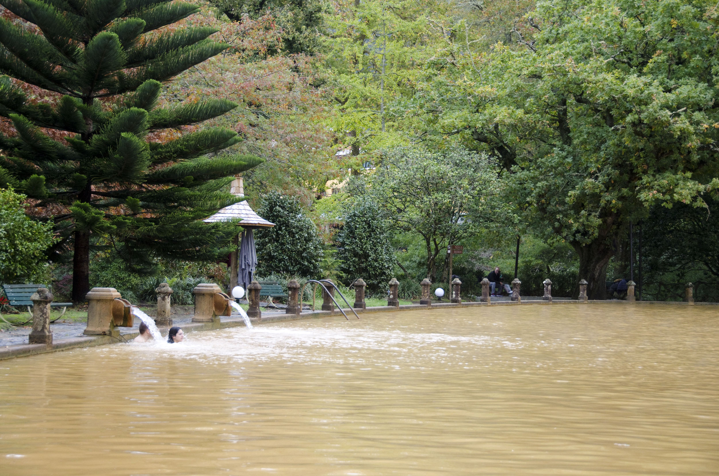 A água é castanha e emana vapores porque a temperatura chega próximo dos 40 graus. É um tanque de água termal com muitos minerais. Medicinal e reconfortante. Só é pouco saudável para os telemóveis que alguns levam para o banho. Para as selfies e para registarem um momento único.