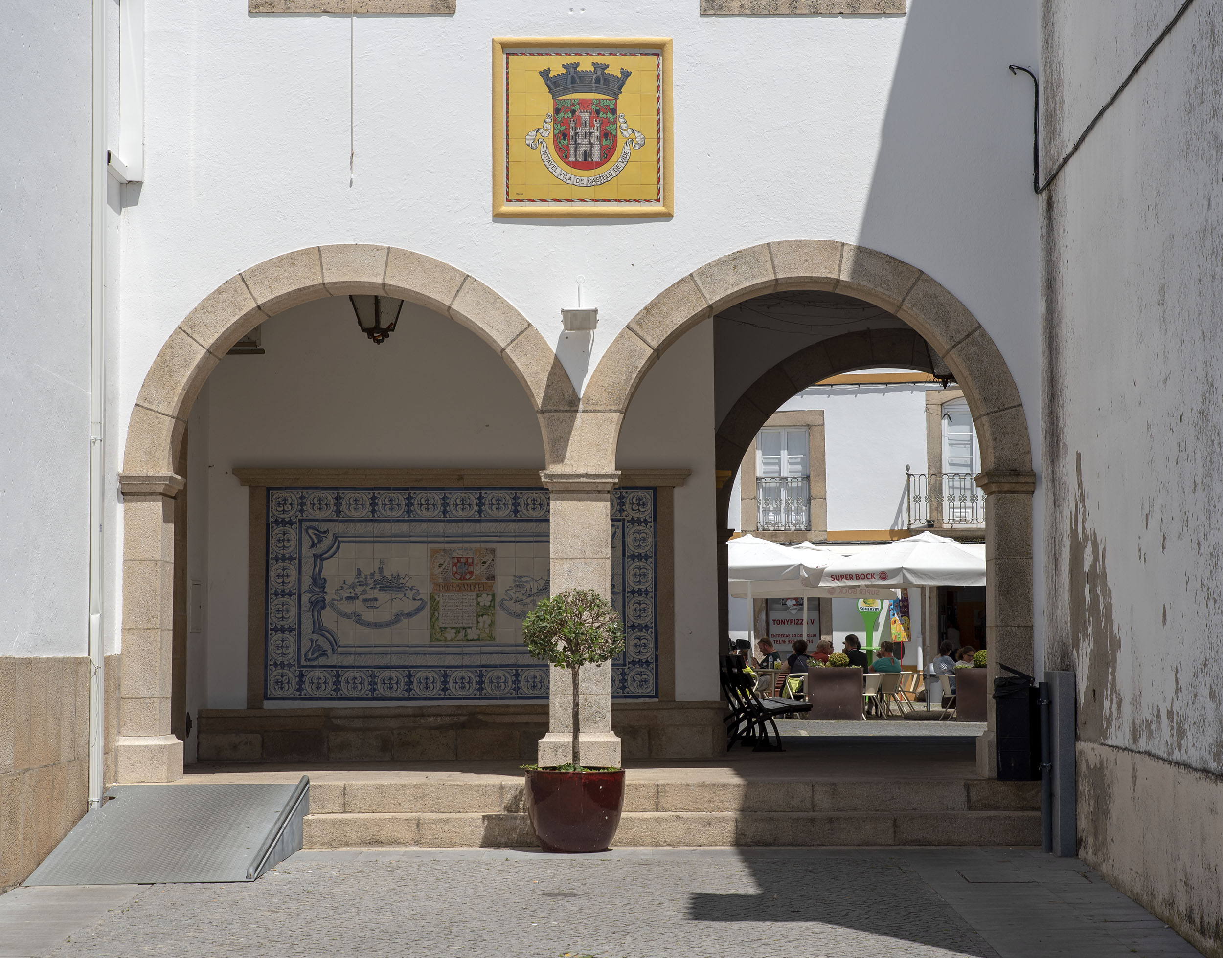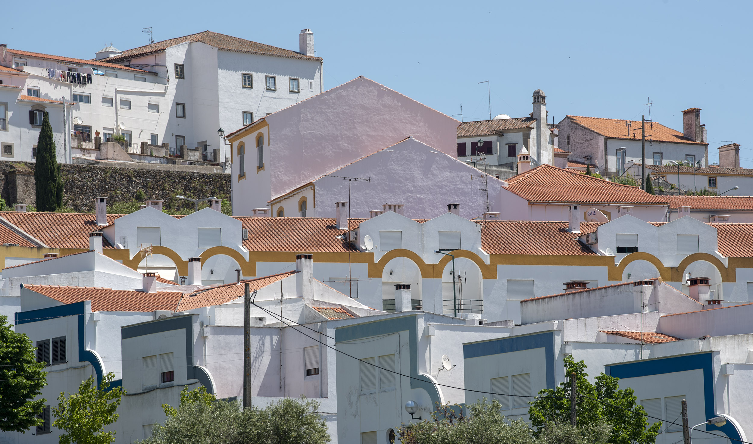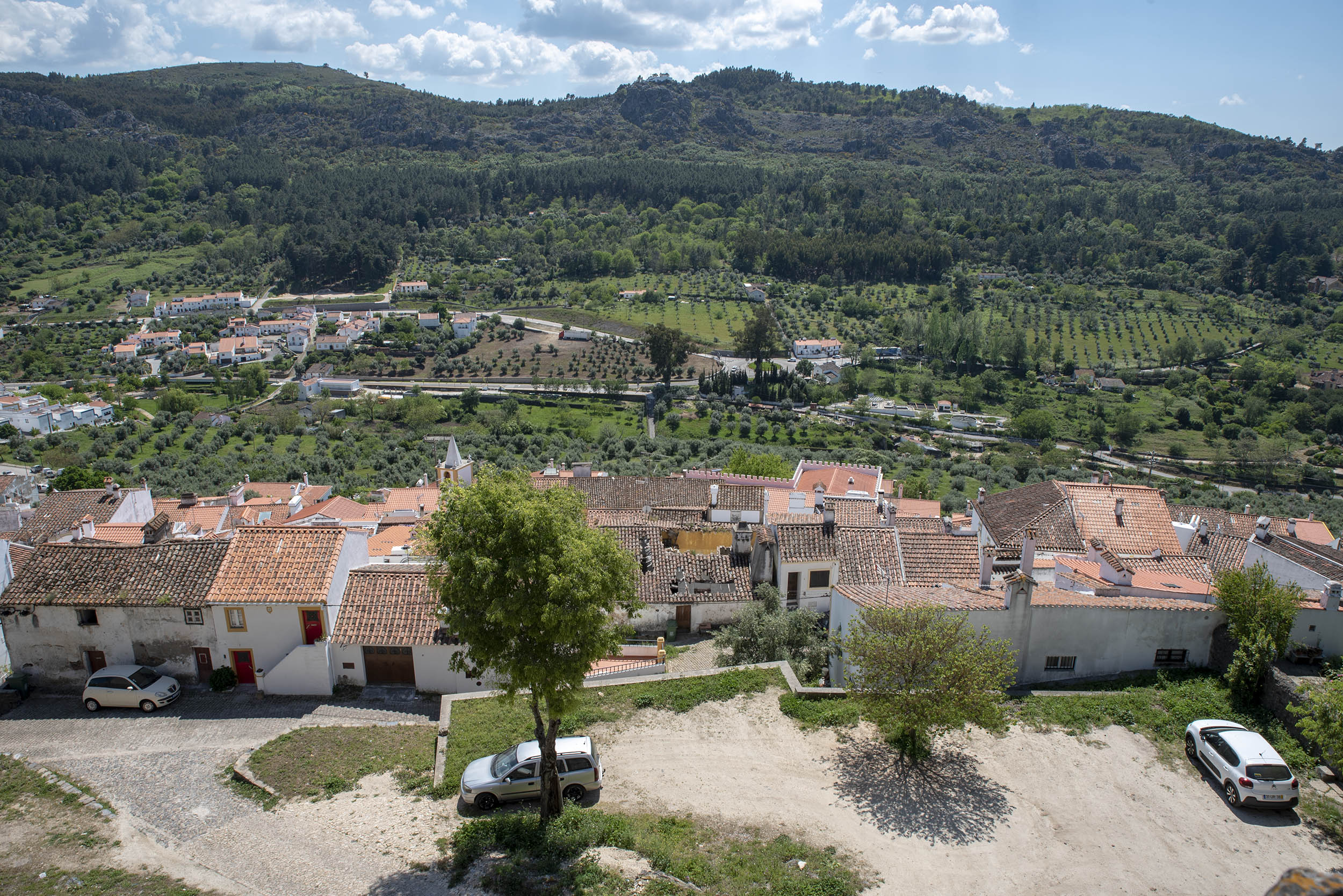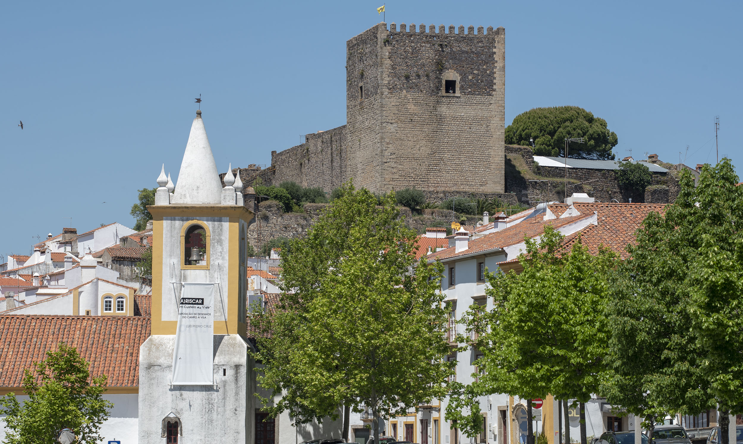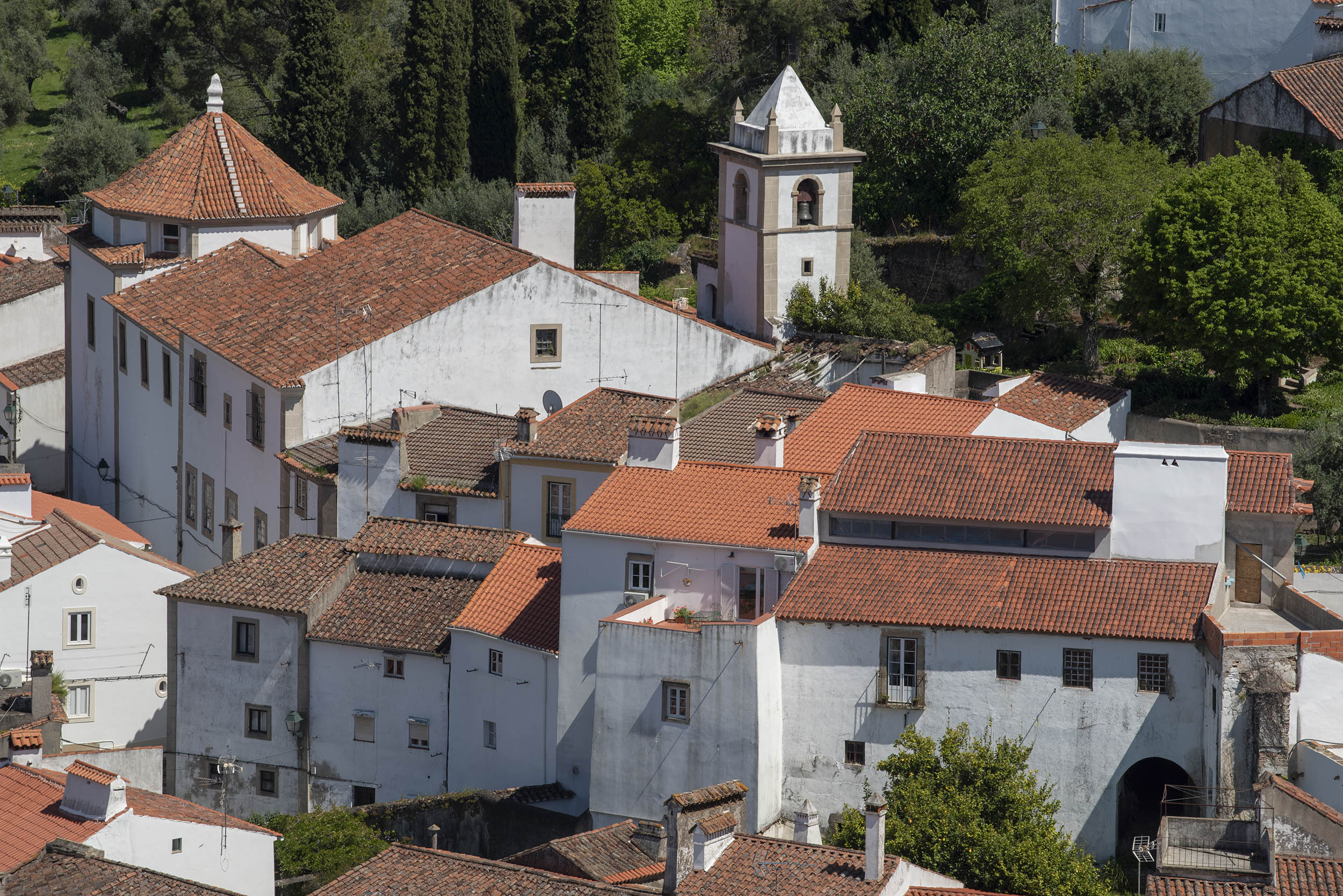 Temos uma visão de conjunto da vila, do casario, da judiaria, dos campanários das igrejas e do verde da serra que nos revela o clima mais fresco e muito diferente do Alto Alentejo.
