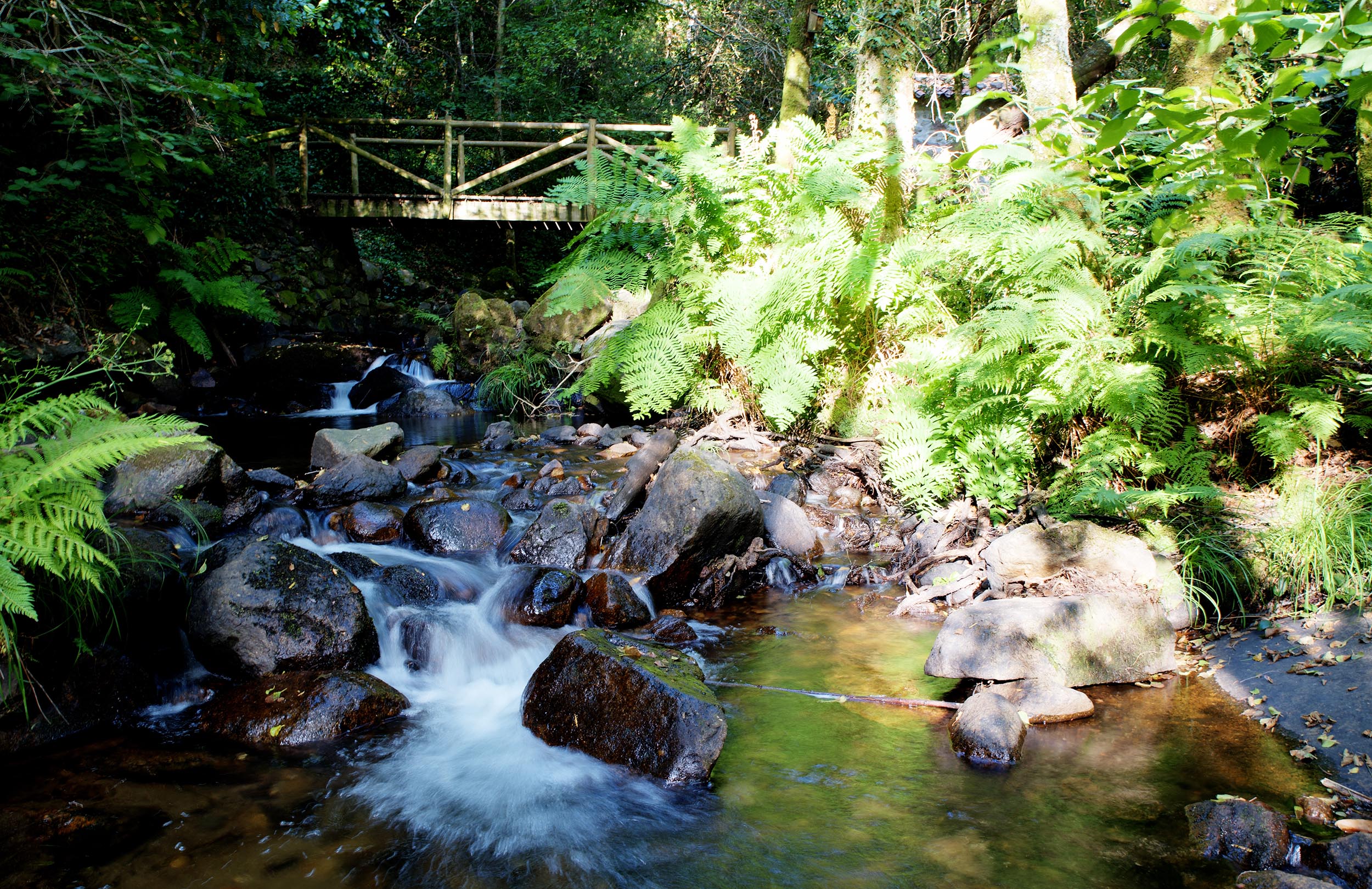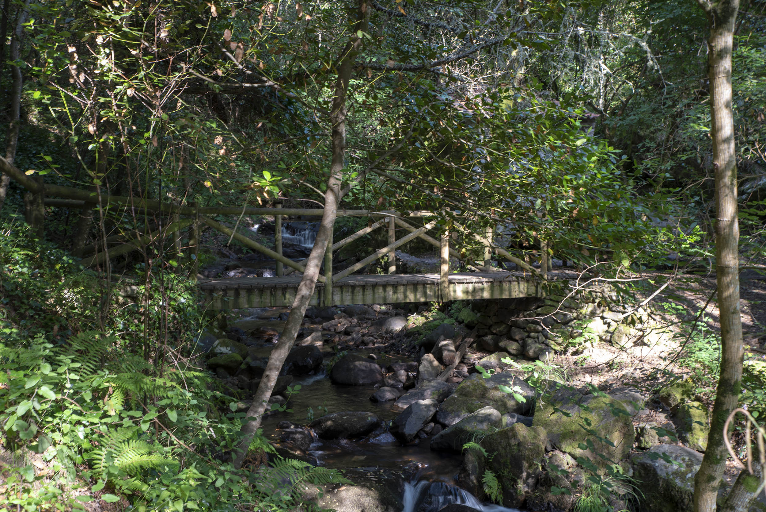 O percurso pedonal tem ainda pontes de madeira que atravessam a ribeira e também encontramos antigas azenhas.