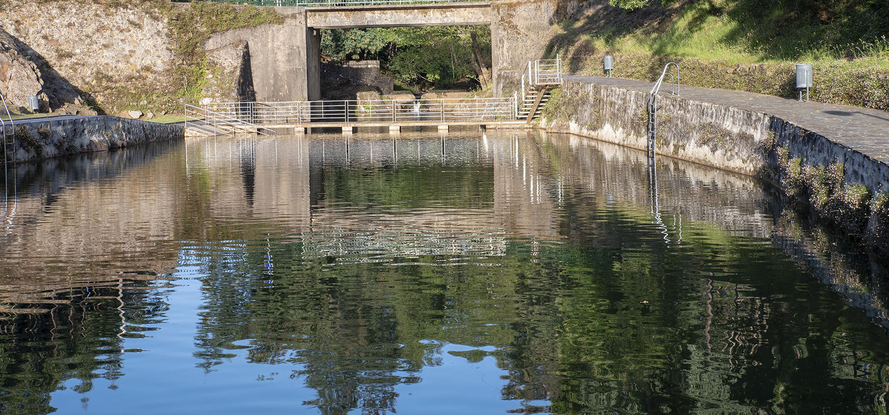 No primeiro espelho de água há uma divisória que marca a separação entre miúdos e graúdos. Antes da ponte pedonal a água dá pela cintura aos miúdos entre 10 e 14 anos. Do outro lado, a profundidade vai aumentando e chega aos três metros, próximo da prancha.