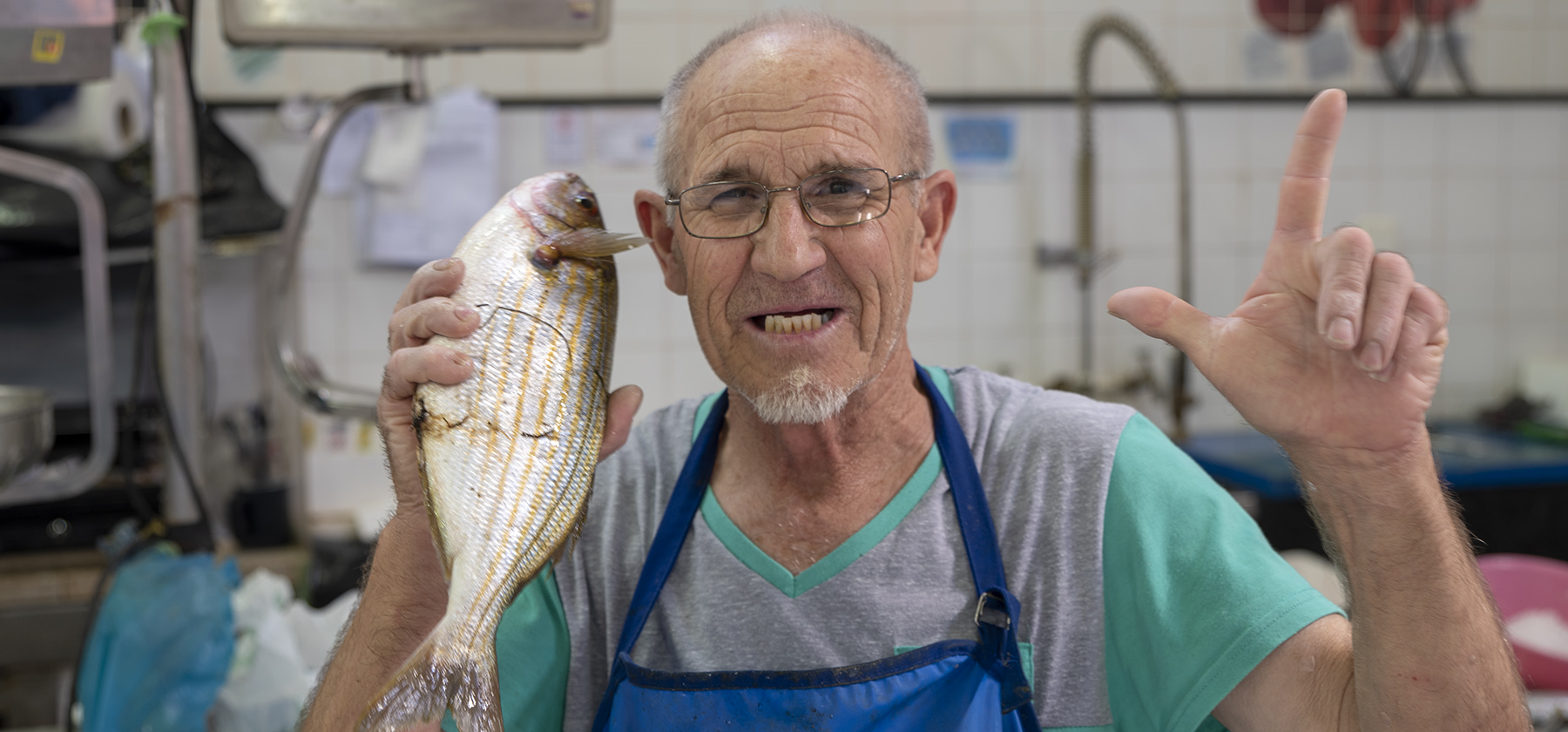 O senhor João, vendedor de peixe levanta-se às 5he uma hora depois está no mercado que abre perto das 6.30h.