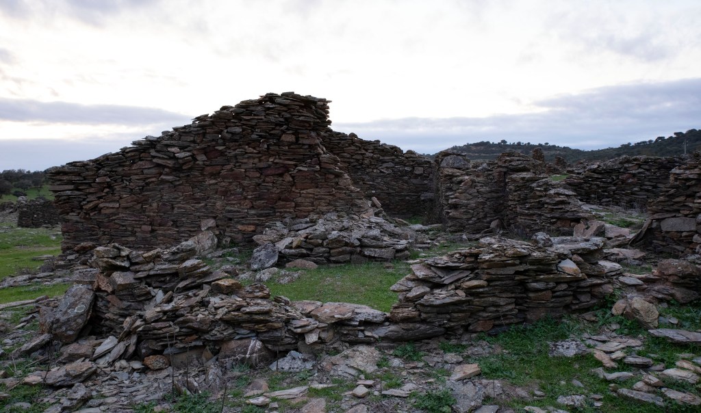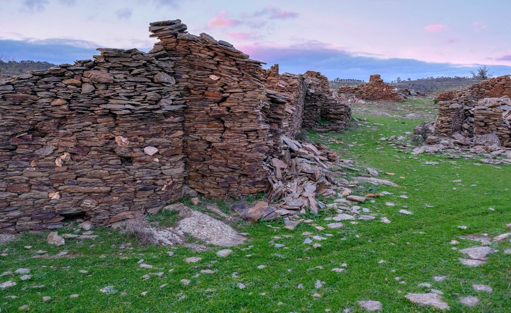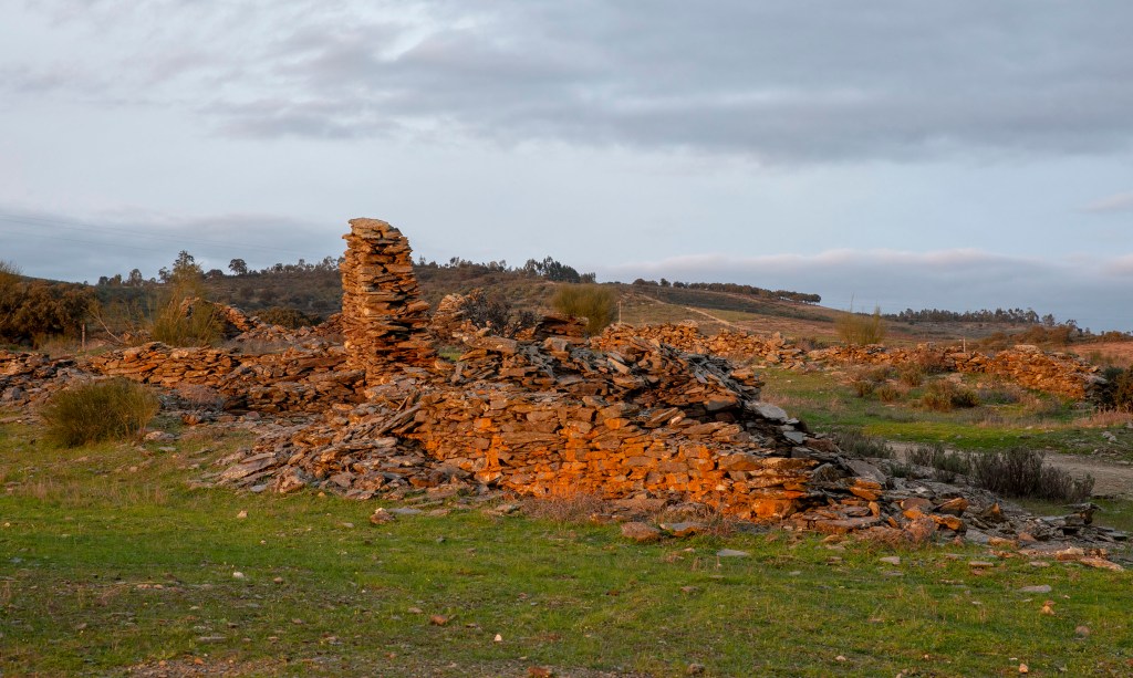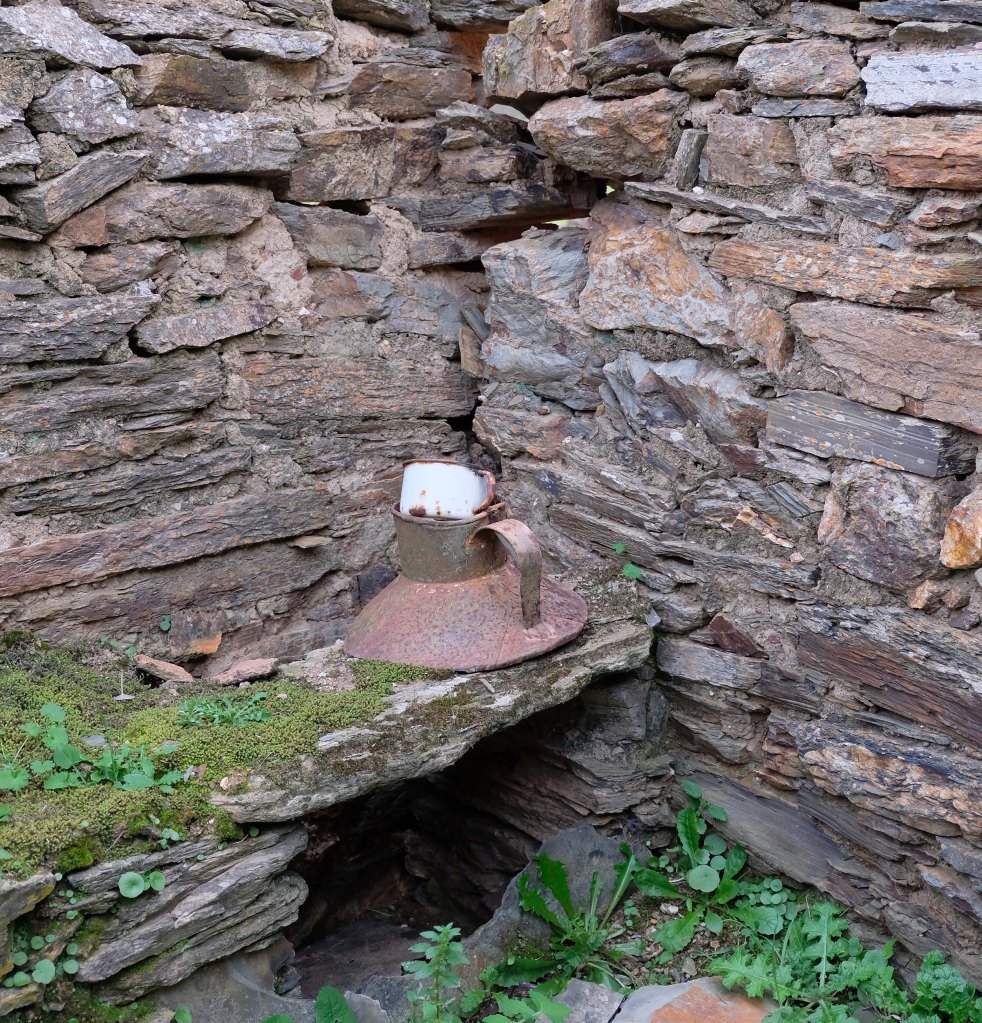 O xisto é também a principal matéria prima usada na construção das casas térreas de Alares. Arlindo Gardete e outro residente em Soalheiras, mais idoso explicam-me o caminho e antecipam o que vou encontrar: “Alares está em ruínas. Se calhar não se vê lá uma casa de pé. Já caiu tudo. Os telhados estão por terra, as paredes também. Aquilo ali era só pedra e barro, como era antigamente.”