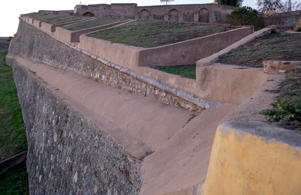 Refere também Margarida Ribeiro, guia em Elvas, que “as alterações posteriores tiveram a ver com a evolução da pirobalística. As muralhas da cidade não estavam preparadas para a devastação provocada pelos canhões. Eram altas, esguias e ocas. A partir de 1641 foram adossadas muralhas mais baixas, em planos inclinados e em formato abaluartado. À prova de bomba.”