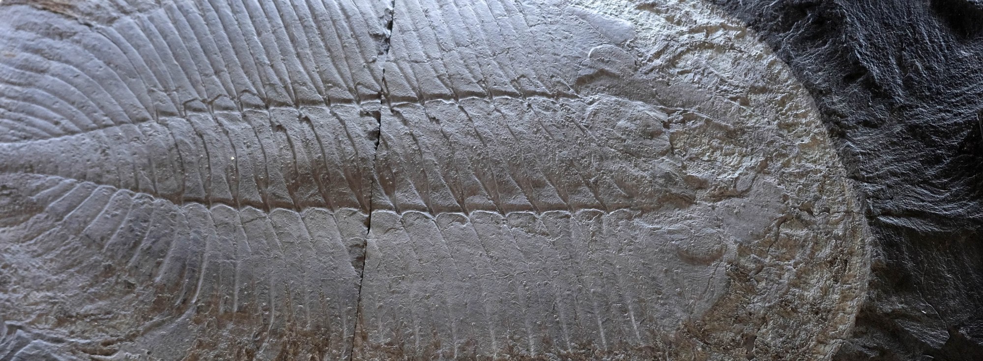 O fundo escuro da lousa realça os relevos de cor mais clara que determinam o tamanho e a textura da carapaça que envolvia as trilobites. O corpo tem três partes, cabeça, tronco e cauda.