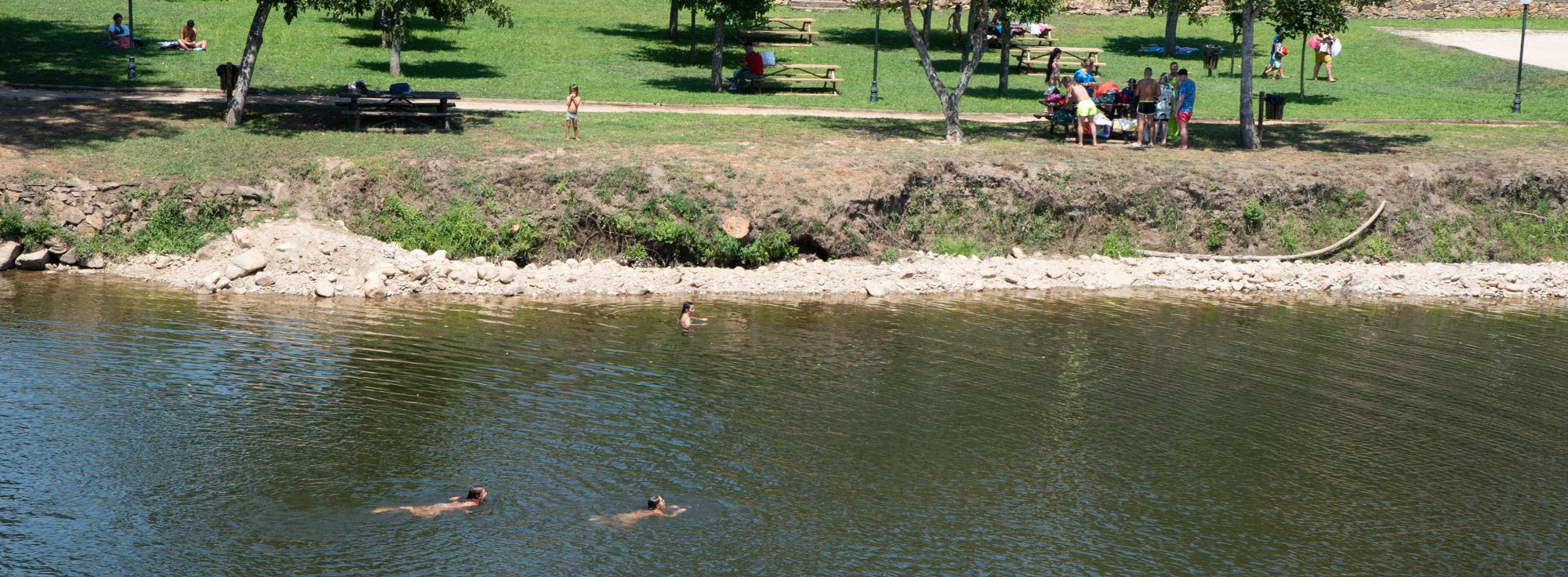 A largura do rio é considerável, mas o leito é rochoso, custa um pouco a entrar. O prazer de nadar compensa o esforço.