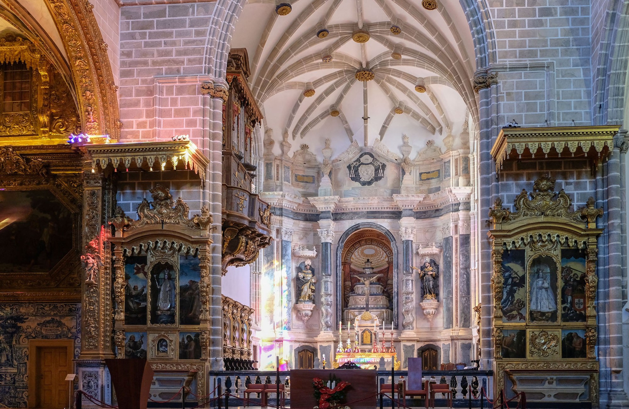 “O altar mor é em mármore porque no século XVIII o cónego Landim, à semelhança do que foi feito na Sé de Évora, desmanchou a capela-mor existente e colocou esta toda em mármore. As laterais, tal qual nós vemos, não eram as primitivas. Tinham pinturas, foram retiradas e levadas para o Museu Nacional de Arte Antiga quando o convento entrou em ruína. Os altares que se encontram agora são provenientes de vários conventos da cidade de Évora.”