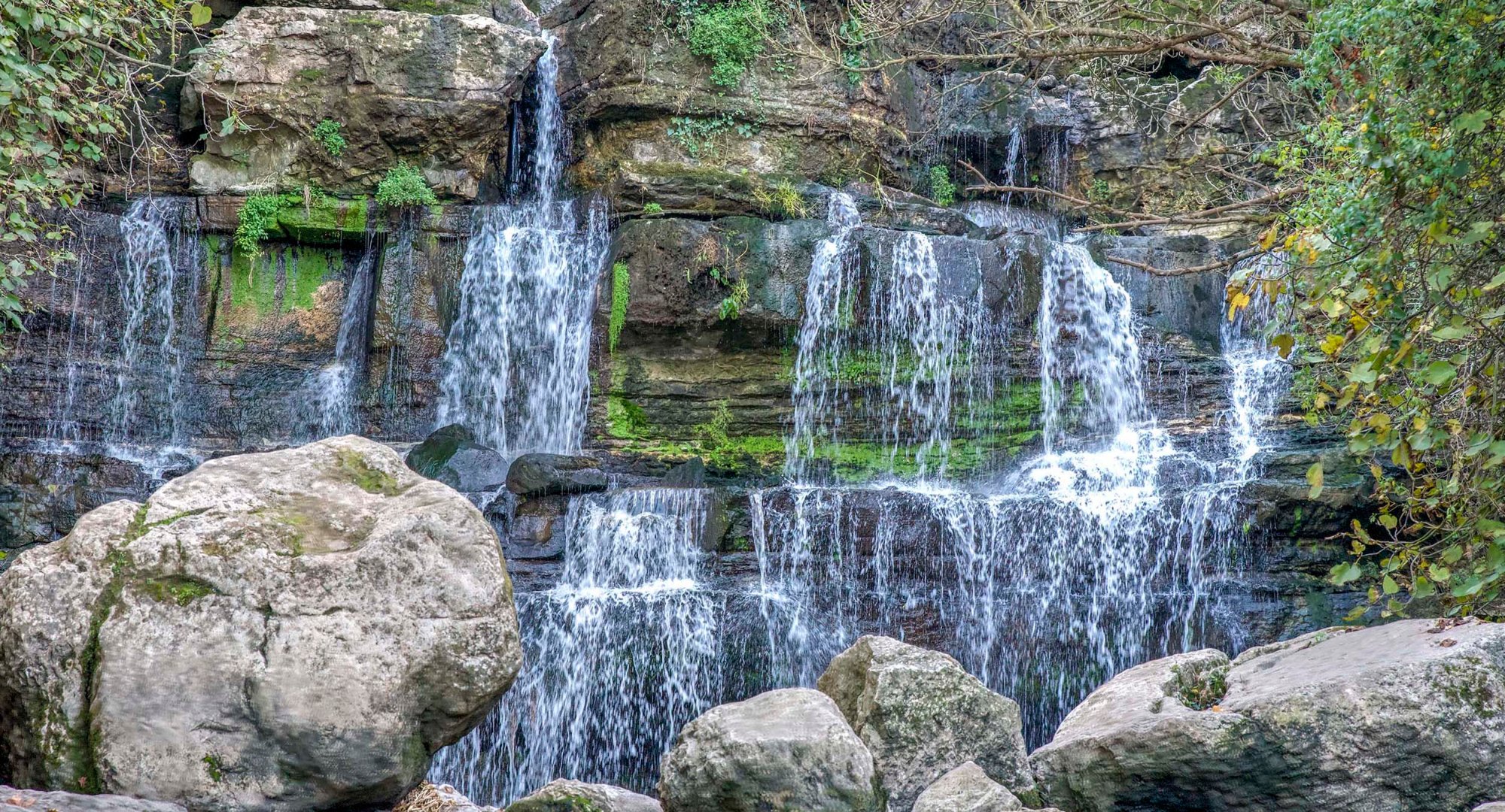 A água passa pelos intervalos de grandes blocos de pedra e depois cai para vários patamares horizontais que formam uma escada de pedra escura que ganha graciosidade e vida com a espuma da água.