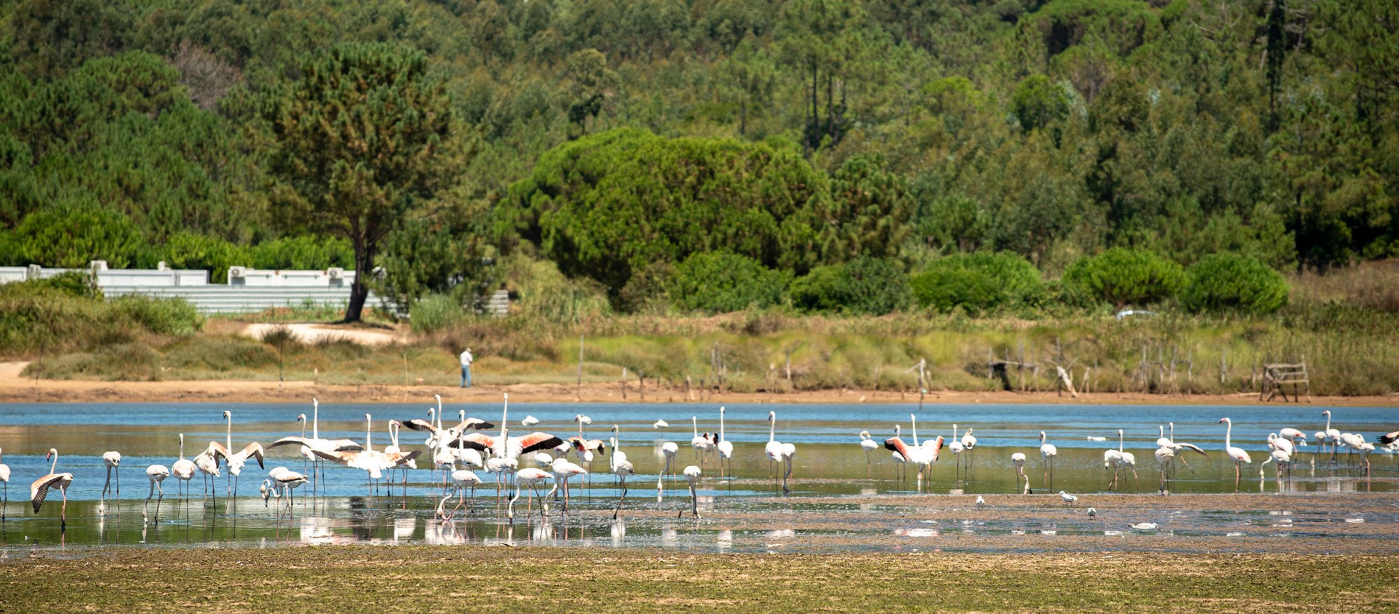 O ambiente é calmo, outras aves como o corvo marinho, pato real ou as garças reais sinalizam a lagoa e os flamingos pareciam mais distendidos, abrindo por vezes as asas de cor laranja.
