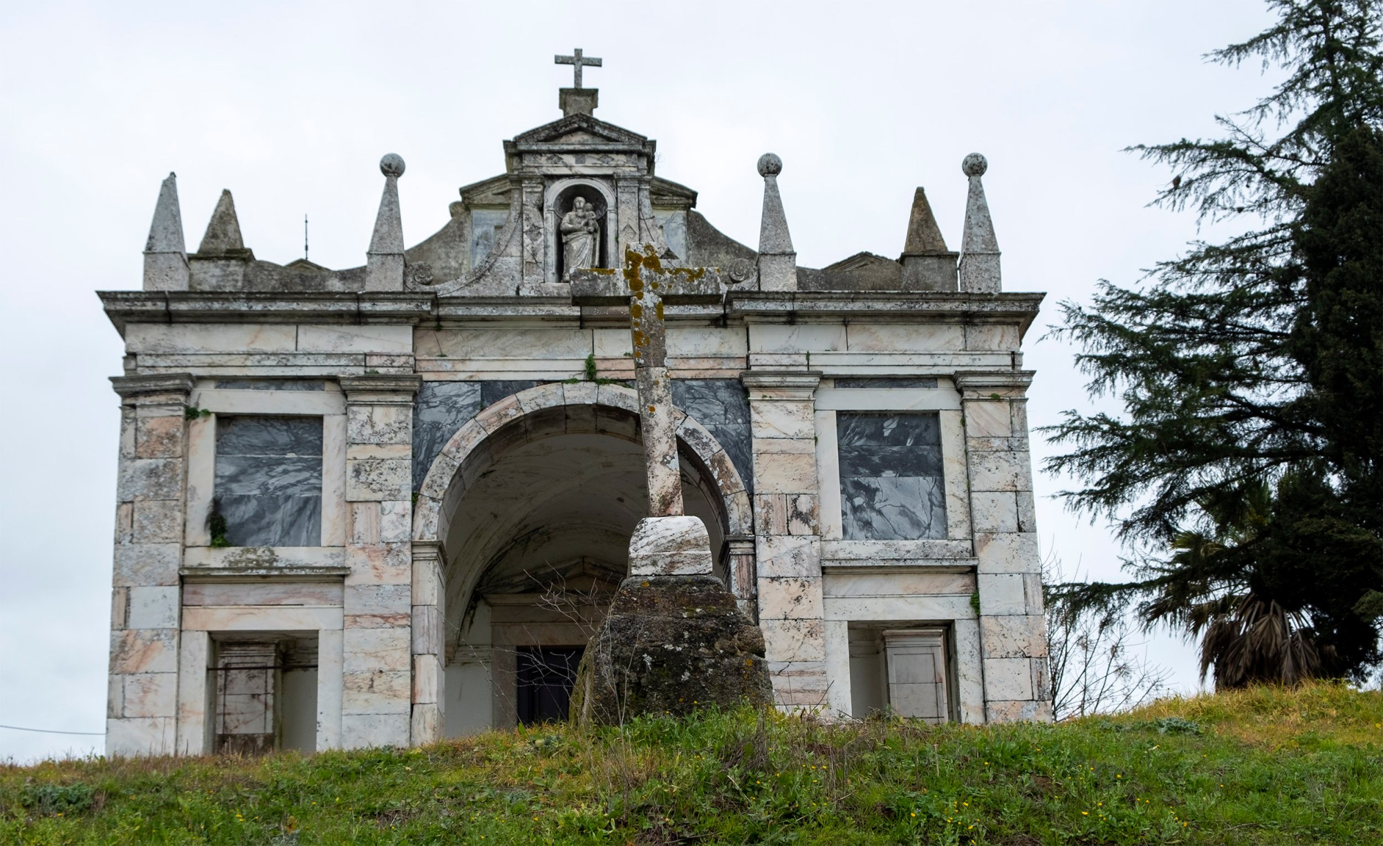 O pórtico tem na parte da frente um arco de volta perfeita e dois laterais mais pequenos. Tudo em mármore e o conjunto destaca-se claramente. No entanto, quando da nossa visita, os tons claros do mármore e da fachada não conseguiam esconder os efeitos da humidade nas paredes.