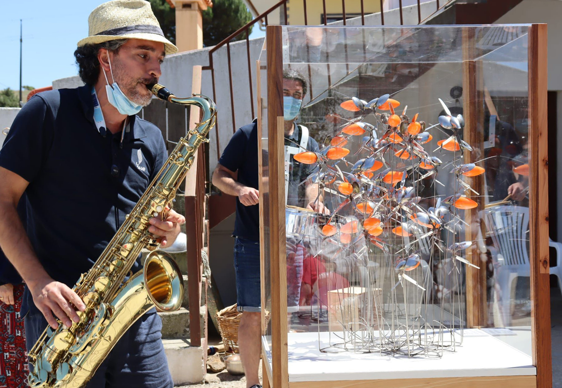 A Praga “é feita de lâmpadas e colheres, mistura vidro com metal.” Quando foi para Fetelaria “tivemos vários encontros de reflexão. A comunidade, deveria criar algo que os caraterizasse. Eles quiseram construir o Vento. Eles vivem perto de uma serra e é uma zona muito ventosa.”