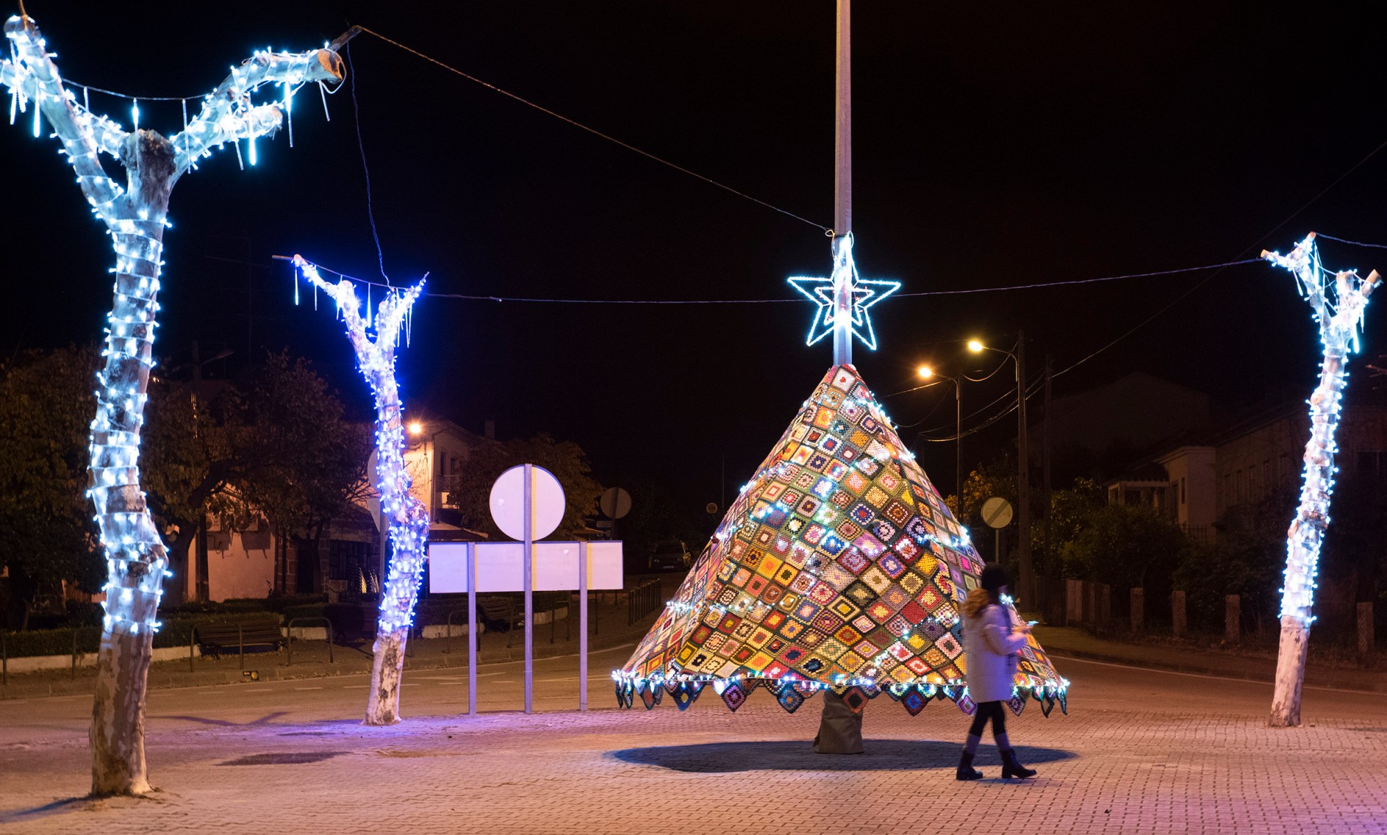 A árvore de Natal é feita de 788 quadrados de croché e dá um colorido único a uma rotunda em Medelim, no concelho de Idanha-a-Nova. Os tons vivos de vermelho, verde e amarelo dão graciosidade à árvore que tem quase quatro metros de altura e 12 de diâmetro.