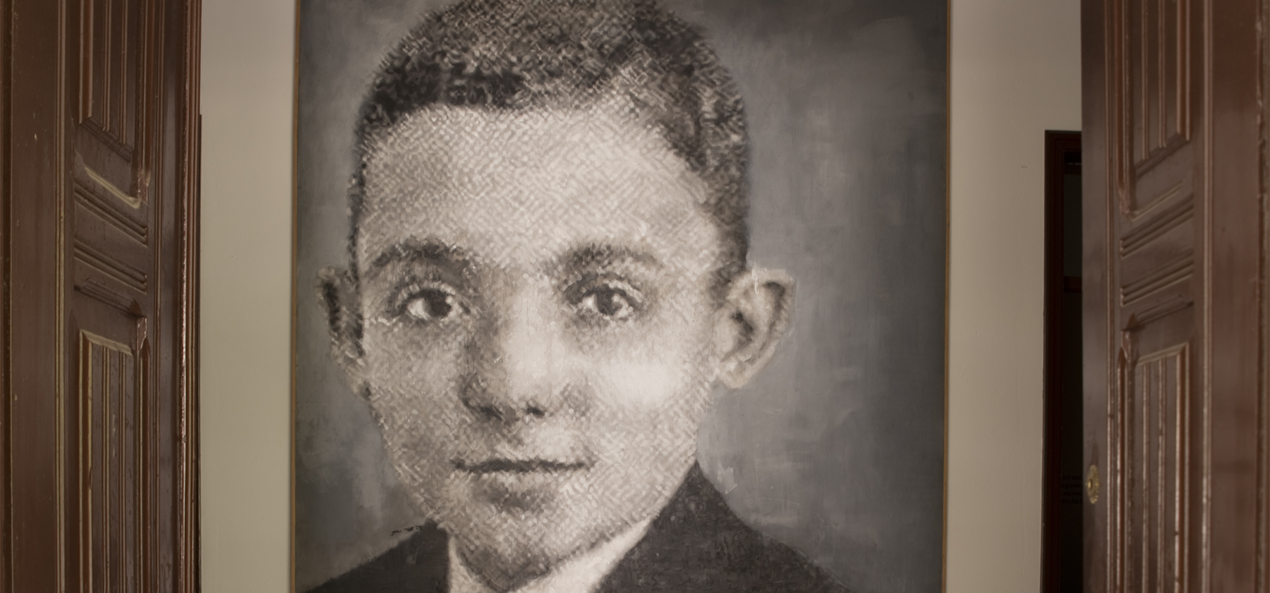A pintura “Zezito” (acrílico y tóner sobre madeira 200×200 Emilio Fornieles ©) na entrada da antiga escola primária aviva a memoria de infância que remonta a 1922, data do nascimento de José Saramago na Azinhaga, no concelho da Golegã e cujo centenário se celebra este ano.