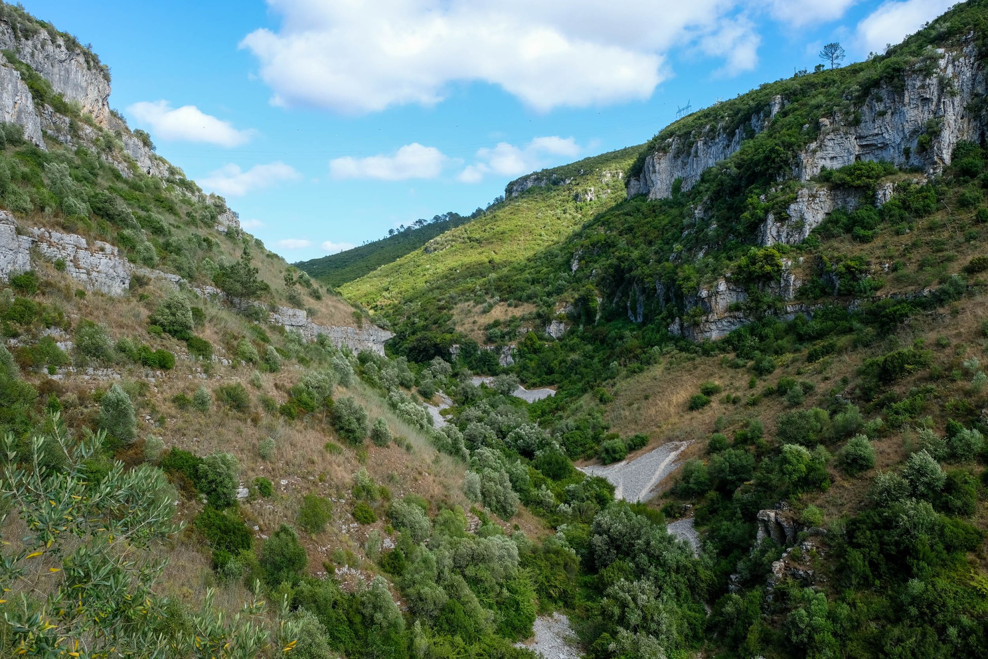 As encostas da serra de Sicó são muito altas e têm enormes blocos de rochas. O tom claro do calcário sobressai entre o verde abundante que cobre o vale.