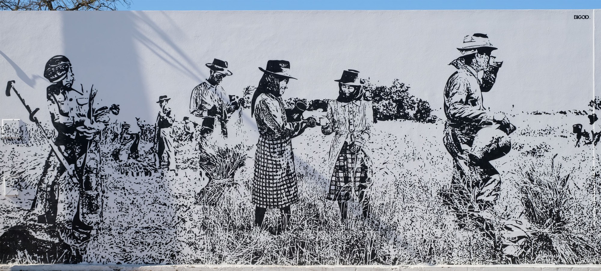 À entrada de Ulme, uma freguesia do concelho da Chamusca, somos surpreendidos com um enorme mural que cobre a empena de uma casa e retrata a apanha tradicional do arroz.