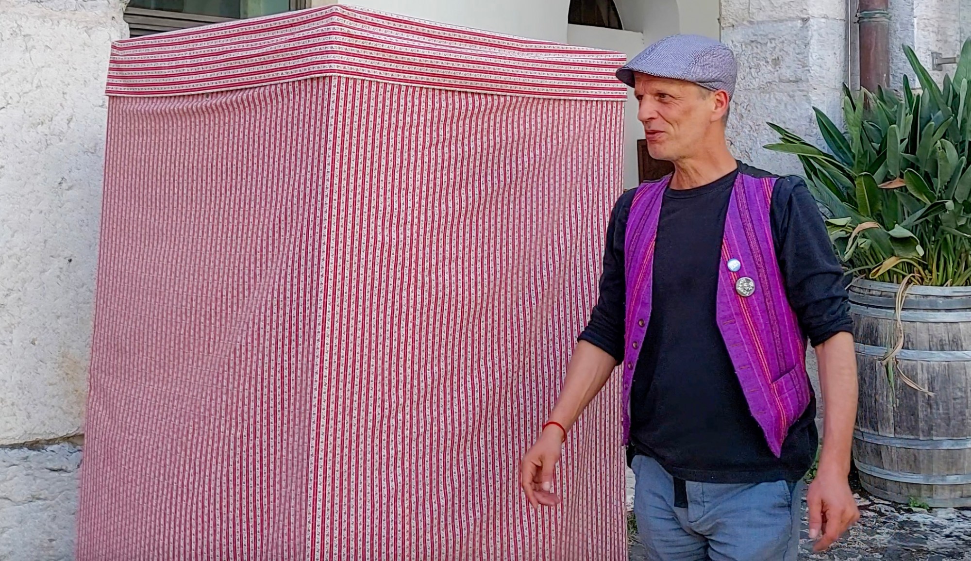 Com o tradicional colete, um boné, os bonecos e uma guarita de pano com listas vermelhas, Raul Constante Pereira dá voz a narrativas com três séculos de história.