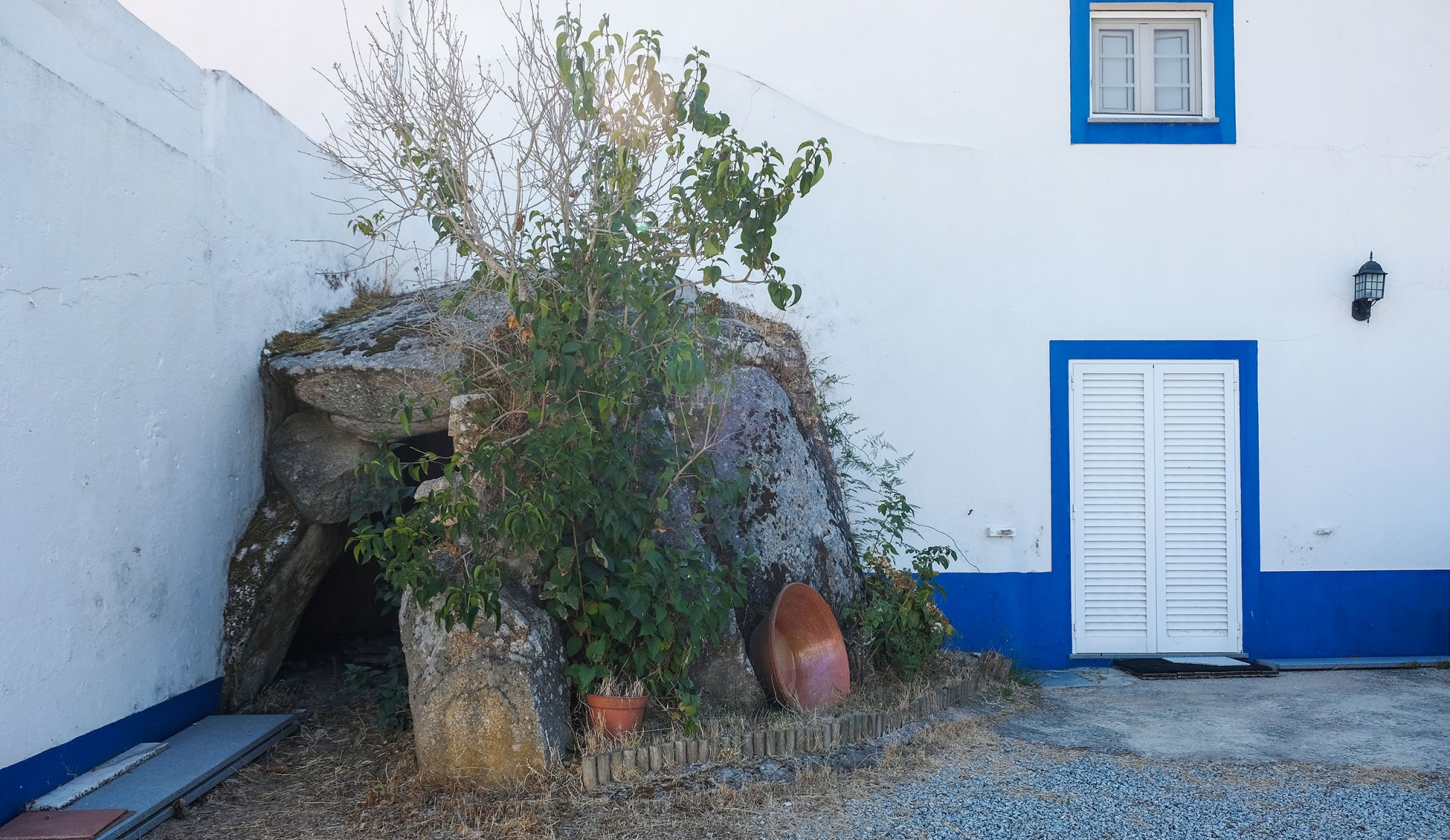 Depois de dobrarmos a última casa da rua deparamos com a anta num canto de uma habitação com paredes brancas e linhas azuis. O granito, a pedra bruta dos sete esteios, faz um grande contraste.