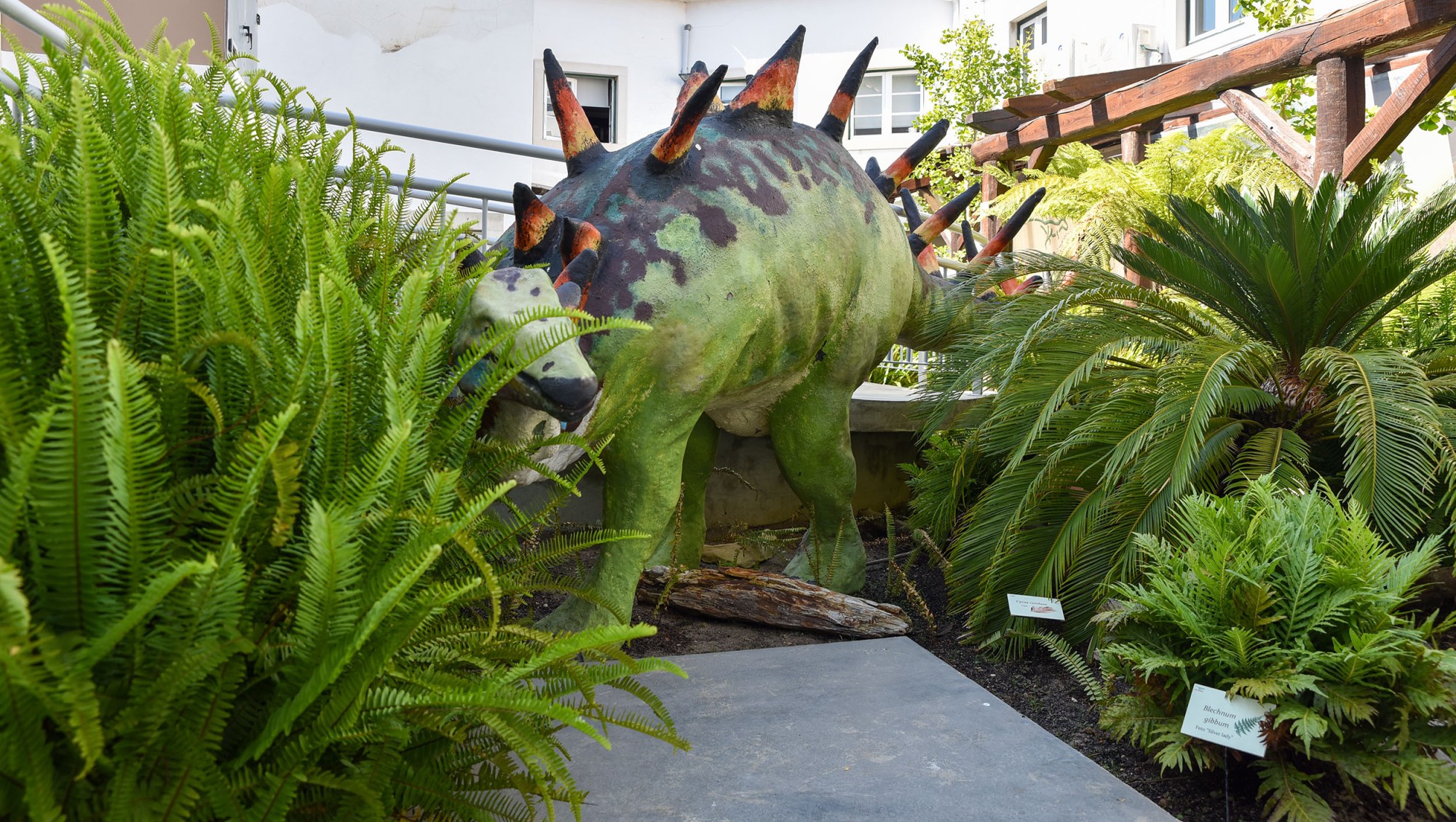 No exterior, a época dos dinossauros é reconstituída com um pequeno jardim jurássico.