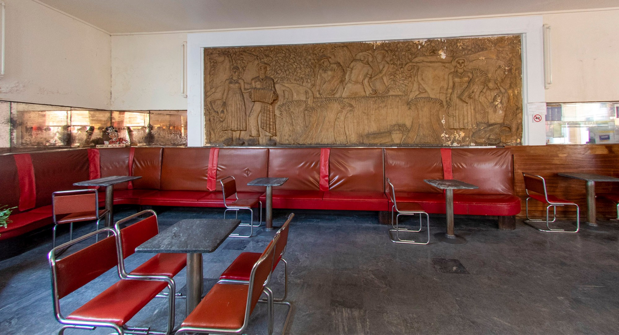 Adelaide Neves, que trabalha no café Alentejano, refere-se a cadeiras metálicas e mesas com tampo de mármore. Há também vários sofás, todos vermelhos, e um deles está junto à parede decorada com um enorme painel de gesso que representa a ceifa.