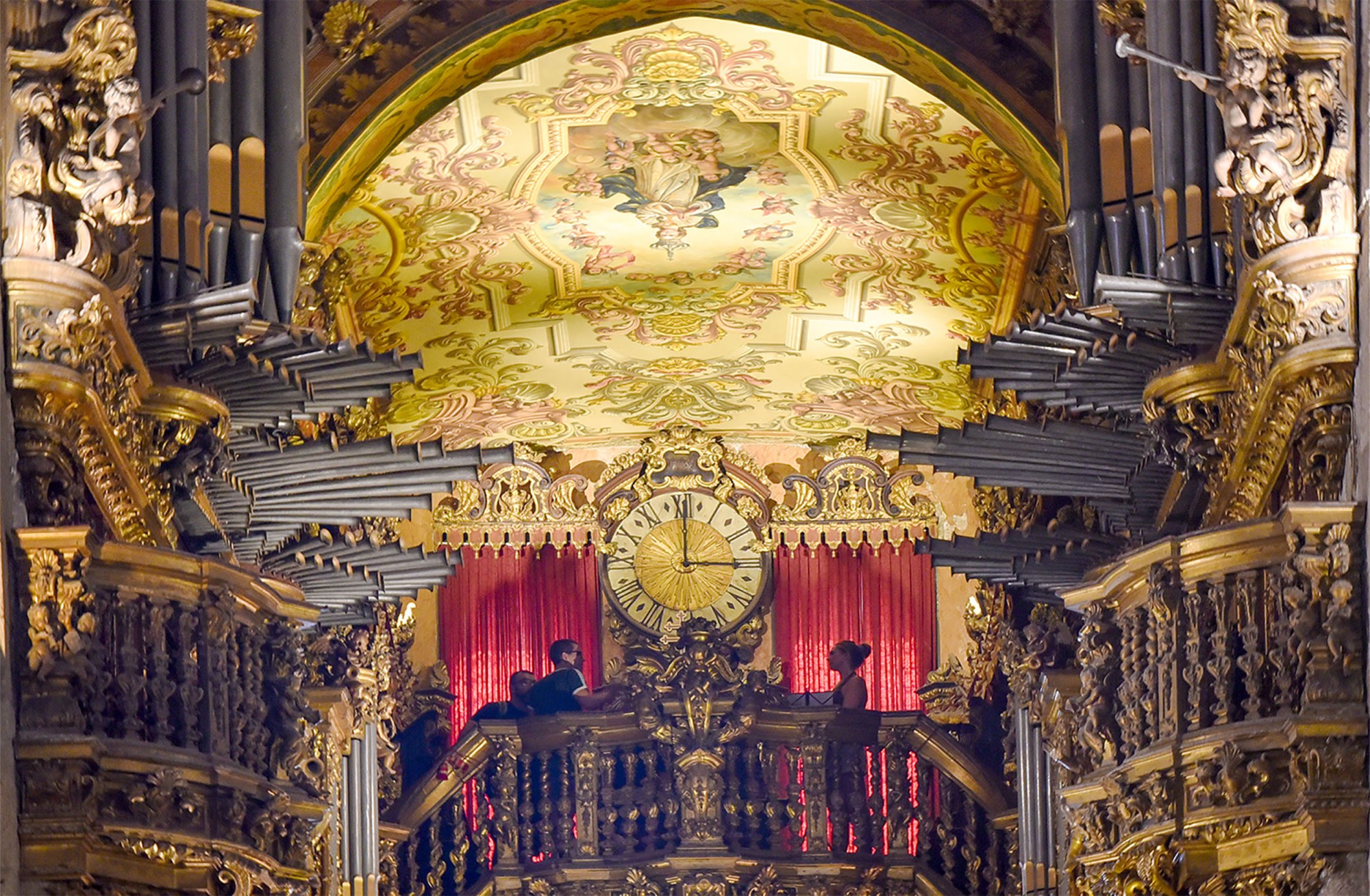 Os tetos decorados com cores vivas, as colunas rodeadas de talha dourada e os órgãos que através de dois varandins se misturam com a decoração do Coro Alto.