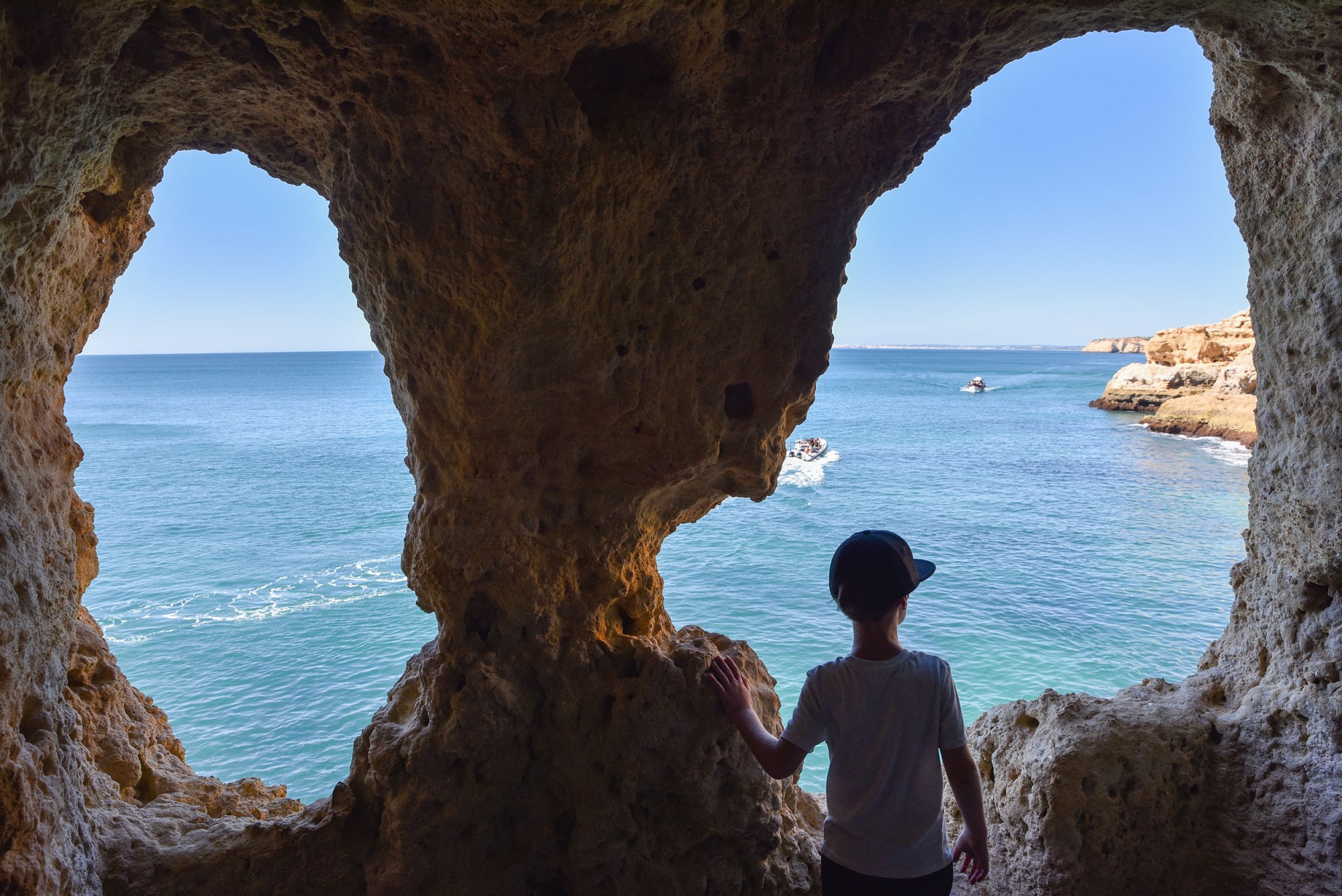 Um dos lugares mais espetaculares e onde melhor sentimos o contraste da cor ocre das rochas e o azul do mar é no interior da gruta. Chamam a Boneca por ter dois orifícios enormes e virados para o mar. “Os dois buracos são os olhos.