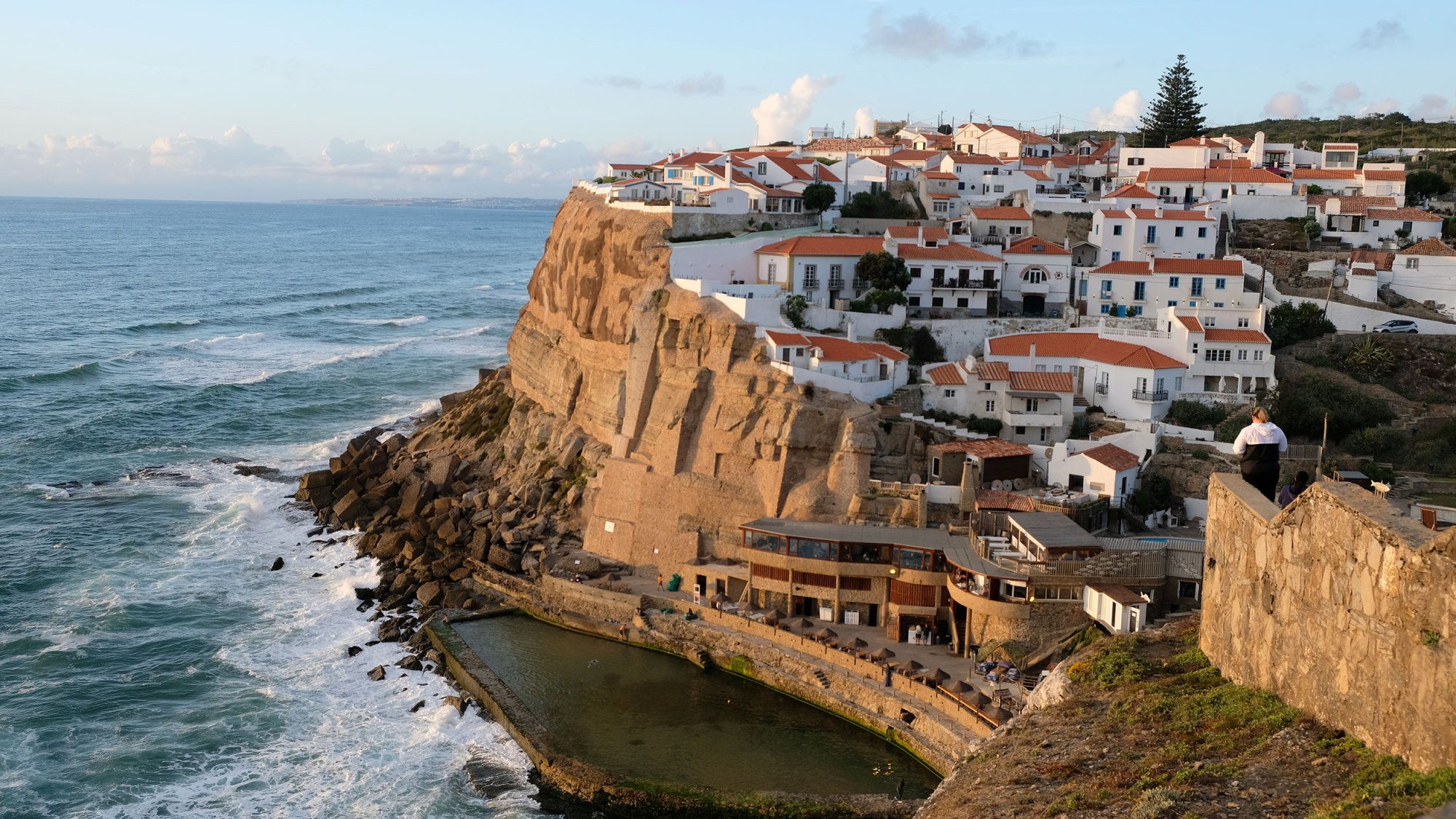 Há uma imagem de Azenhas do Mar que corre mundo: a aldeia protegida por uma enorme falésia e o branco das casas a desenhar linhas suaves que descem até ao mar. De forma graciosa, mais bonita ainda ao pôr do sol e ao anoitecer.