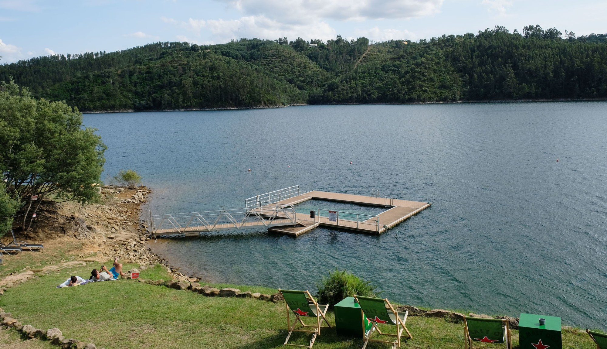 A praia fluvial fica num ligeiro declive, abrigado, e tem uma piscina flutuante com cerca de metro e meio de profundidade.