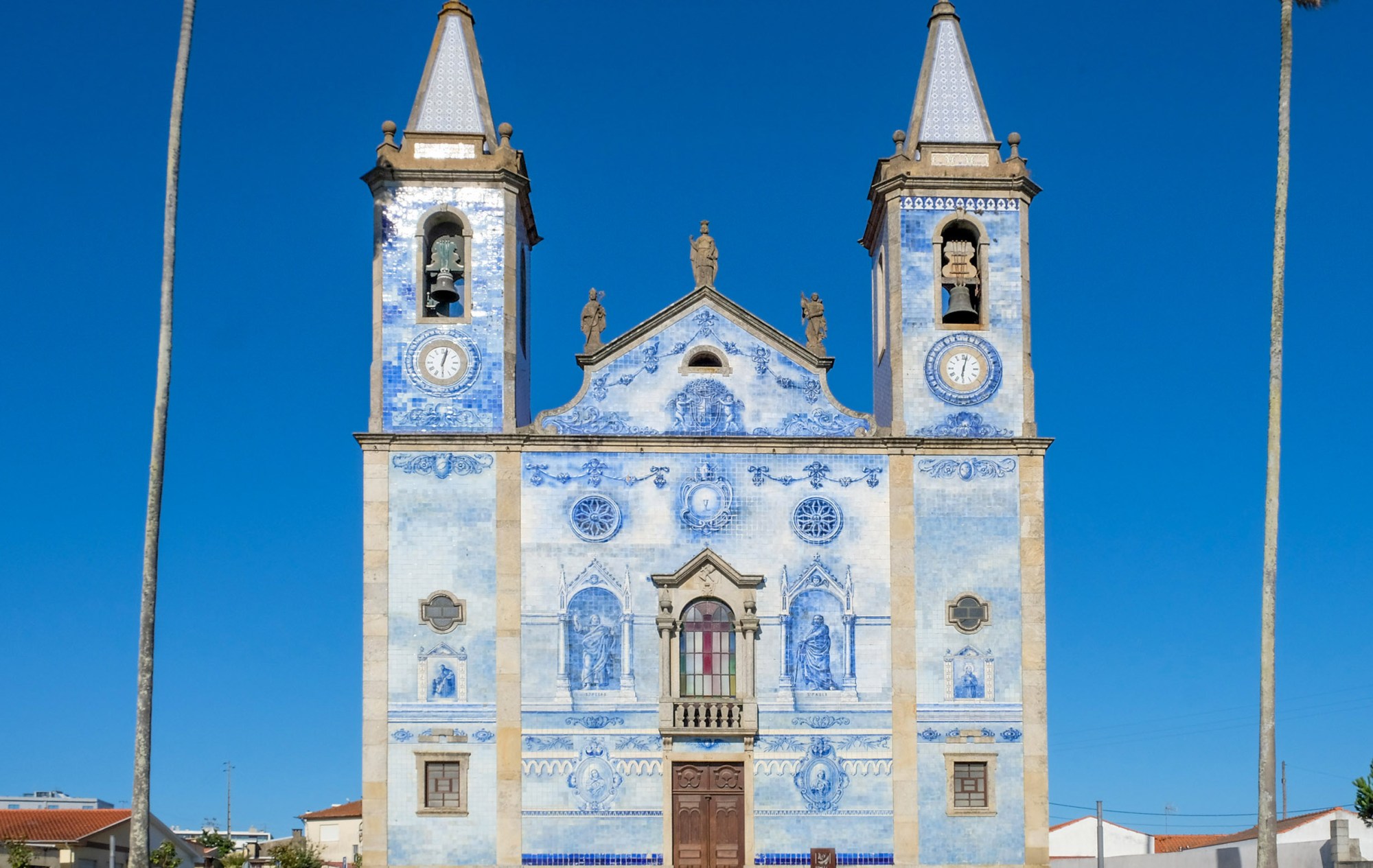 Dos vários tons de azul que a iconografia religiosa retrata as portas do céu, certamente vamos encontrar alguns na fachada da Igreja de Santa Marinha de Cortegaça revestida a azulejos.