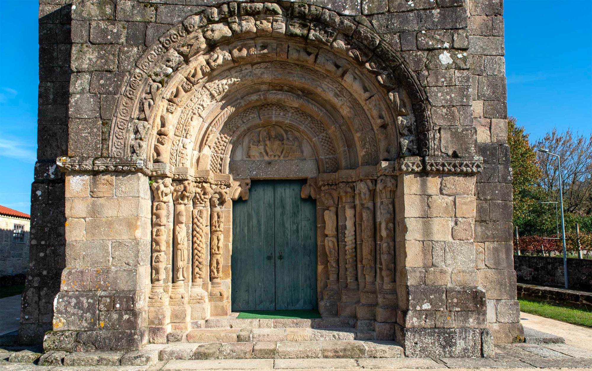 O estilo românico destaca-se em particular no fabuloso trabalho decorativo do pórtico.