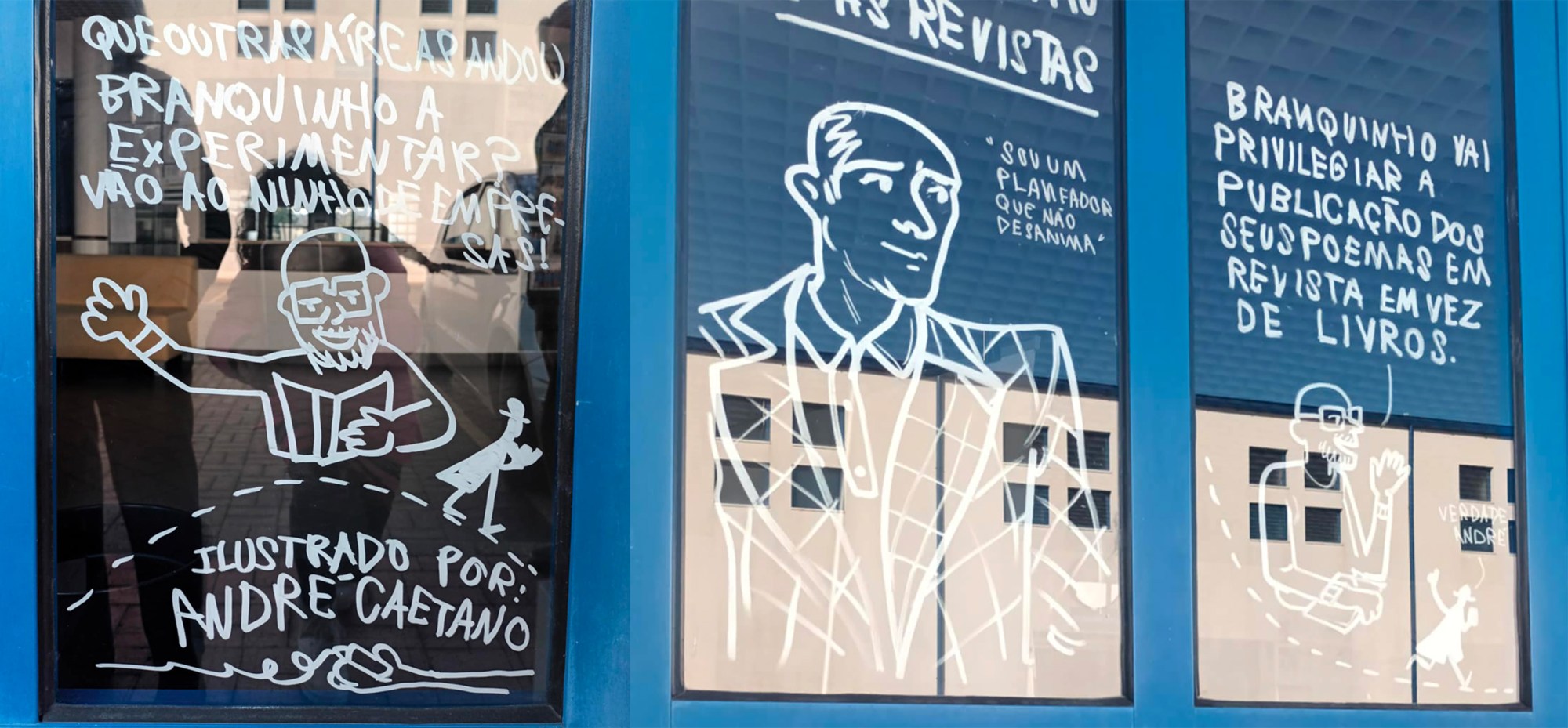 As ilustrações são da autoria de André Caetano e estão em áreas envidraçadas de equipamentos públicos na vila de Mortágua.