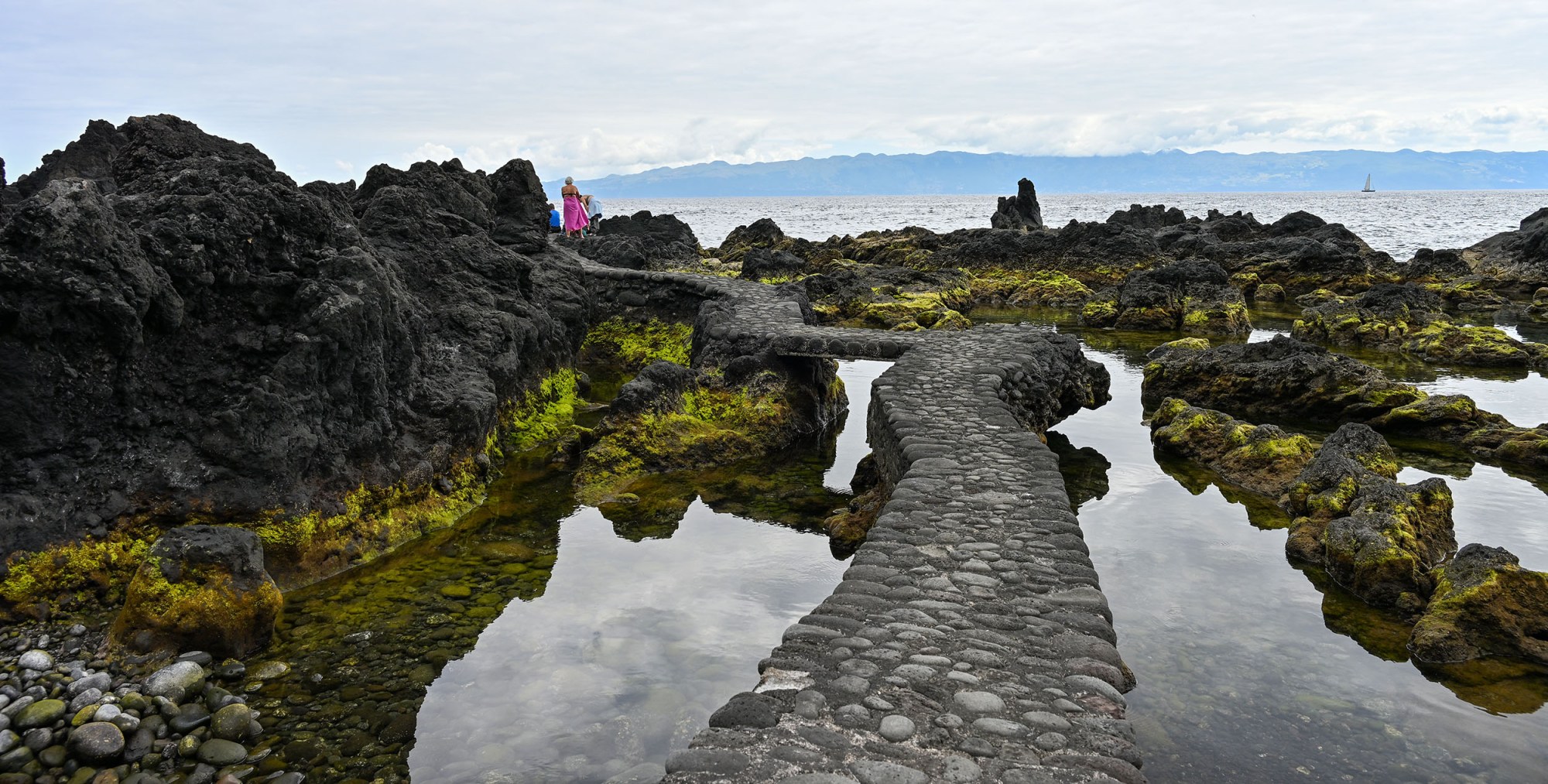 A vista tem sempre presente a ilha do Pico, mas o olhar tem de ser cauteloso para circularmos entre as rochas.